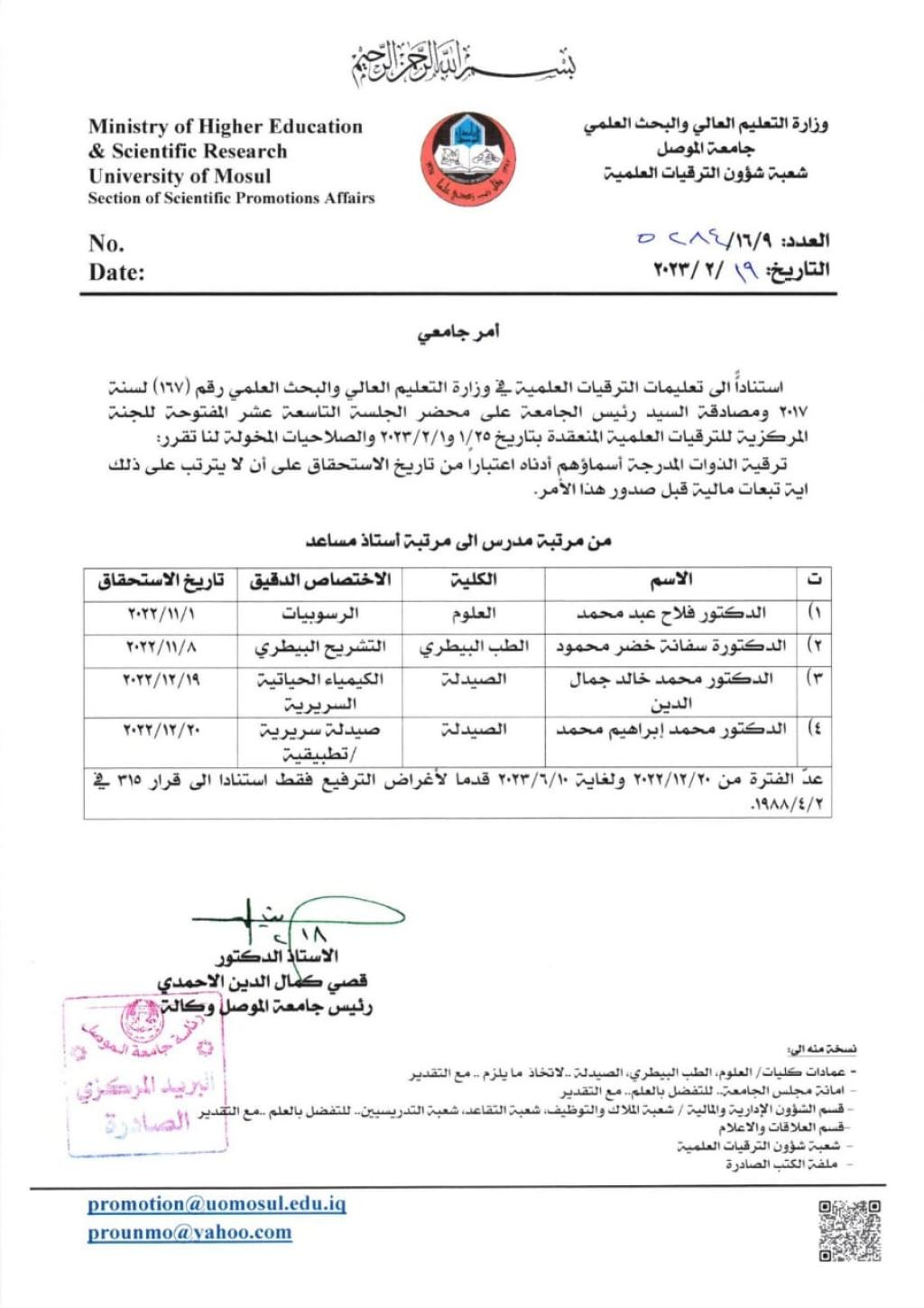 تهنئة بمناسبة الترقية العلميةتتقدم عمادة كلية الصيدلة بجامعة الموصل ممثلة بالسيدة عميد الكلية الاستاذ المساعد الدكتورة زينة عبد المنعم عبد المجيد وبالنيابة عن كافة منتسبي الكلية من تدريسيين وموظفين بالتهنئة الى الدكتور محمد خالد جمال الدين التدريسي في فرع العلوم المختبرية السريرية والدكتور محمد ابراهيم محمد التدريسي في فرع الصيدلة السريرية بمناسبة الترقيته العلمية من مرتبة مدرس الى مرتبة استاذ مساعد.