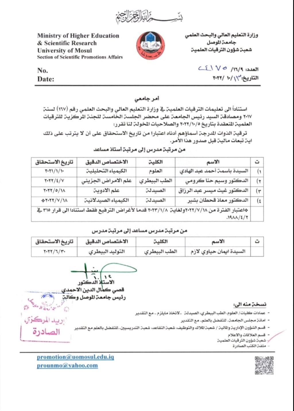 تهنئة بمناسبة الترقية العلميةتتقدم عمادة كلية الصيدلة بجامعة الموصل متمثلة بالسيدة عميد الكلية الاستاذ المساعد الدكتورة زينة عبد المنعم عبد المجيد وبالنيابة عن كافة منتسبي الكلية من تدريسيين وموظفين بالتهنئة الى الدكتور غيث ميسر عبدالرزاق التدريسي في فرع الادوية والسموم والدكتور معاذ قحطان بشير التدريسي في فرع الكيمياء الصيدلانية بمناسبة الترقيته العلمية من مرتبة مدرس الى مرتبة استاذ مساعد.