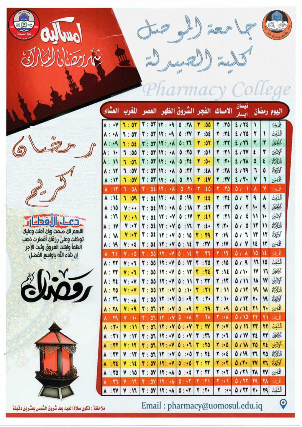 تتقدم عمادة كلية الصيدلة متمثلة بالاستاذ المساعد الدكتورة (زينة عبد المنعم عبد المجيد ) عميد الكلية بالتهنئة لكافة منتسبي الكلية (تدريسيين وموظفين) وطلبتها بمناسبة حلول شهر رمضان المبارك.. اعاده الله عالجميع بالخير والبركة وكل عام وانتم بخير.