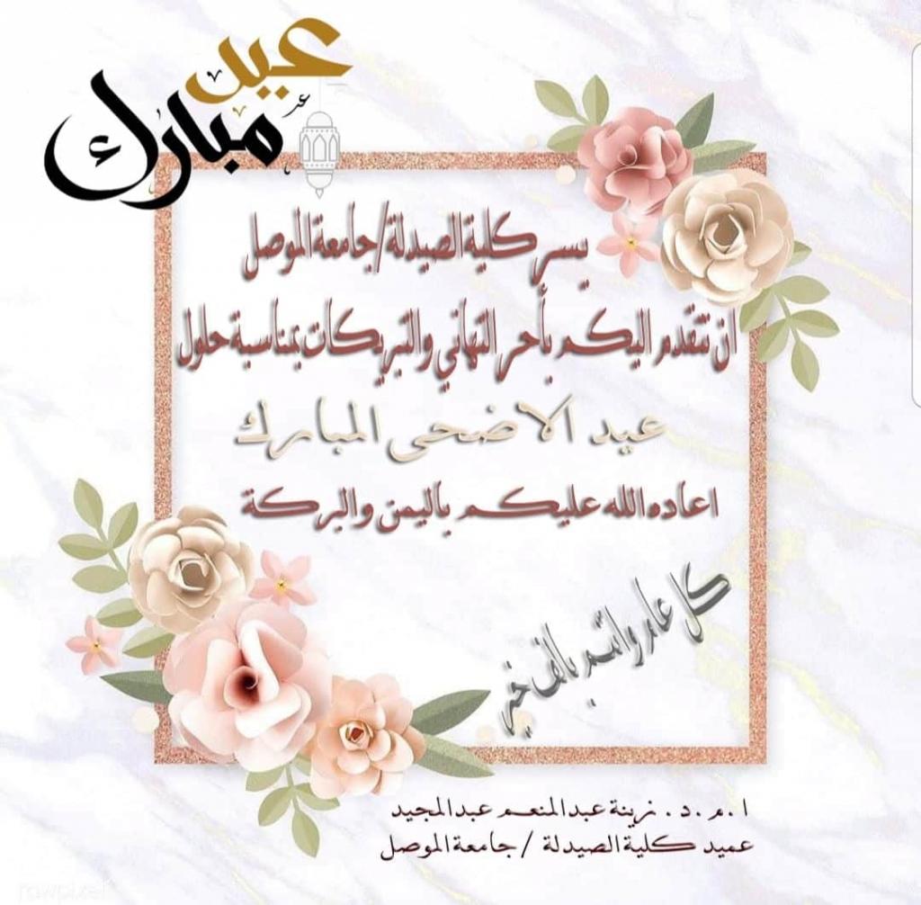 يسر عمادة كلية الصيدلة متمثلة بعميدتها الاستاذ المساعد الدكتورة زينة عبد المنعم عبد المجيد ان تتقدم بازكى ايات التهاني والتبريكات للمنتسبين كافة من اعضاء الهيئة التدريسية والموظفين والطلبة الاعزاء بمناسبة حلول عيد الاضحى المبارك. نسأل الله العلي القدير ان يعيده على الجميع اعواما عديدة بمزيد من العزيمة والإصرار على النجاح والتفوق وان يرزقنا واياكم الصحة والعافية وأن يحفظنا جل جلاله من كل داء ويرفع عنا البلاء والوباء ويقينا الشر والشرور والأعداء.ورحم الله تعالى أرواحا شاركتنا في أعياد مضتولم تكن حاضرة معنا في هذا العيد..ودمتم سالمين باذن الله تعالى …ا.م.د.زينة عبد المنعم عبد المجيدعميد كلية الصيدلةجامعة الموصل