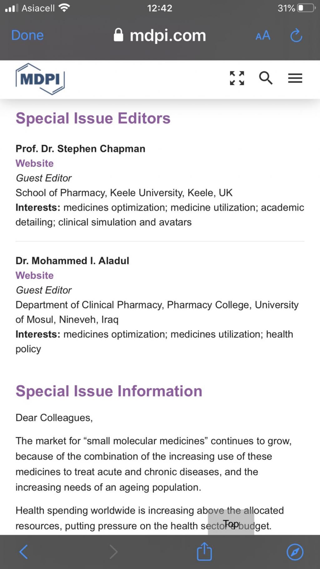 تتقدم عمادة كلية الصيدلةجامعة الموصل متمثلة بالاستاذ المساعد الدكتورة زينة عبدالمنعم عبدالمجيد المحترمةورئيسة فرع الصيدلة السريرية متمثلةبالاستاذ الدكتورة مي عطاالله الجماس باحر التبريكات والتهاني الى المدرس الدكتورمحمد ابراهيم محمد التدريسي فيفرع الصيدلة السريريةبمناسبة اختيارهمحرراً زائراً فيمجلة Pharmacyاللتي تقع ضمن مستوعبات كلاريفيت.ويعكس هذا الإنجاز القدرات العلمية المتميزة لأساتذةكلية الصيدلةوتميزهم ومواكبتهم للتطور العالمي في البحث العلمي في المجال الطبي و الصيدلانيhttps://www.mdpi.com/journal/pharmacy/special_issues/small_molecular_medicines_market_analysis