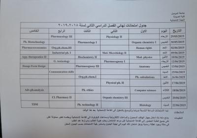 جدول الامتحانات النهائية لطلبة كلية الصيدلة/ جامعة الموصل للعام الدراسي 2018-2019 ( الدور الأول )