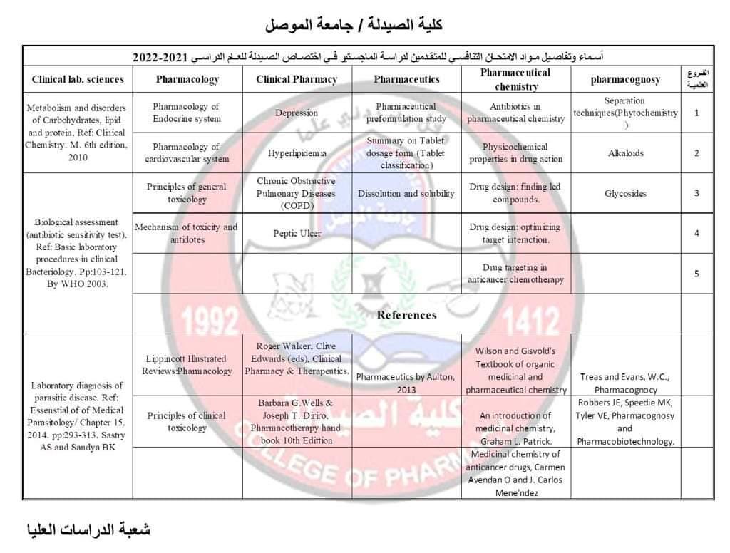 ادناه جدول بالمواد الدراسية والمراجع العلمية المعتمدة في الامتحان التنافسي للمتقدمين لدراسة الماجستير في اختصاص “الصيدلة” للعام الدراسي ٢٠٢٠-٢٠٢١ والذي سيجرى بتاريخ ٢٠/ ٦/ ٢٠٢١.للإطلاع على ضوابط التقديم والقبول في الدراسات العليا داخل العراق للعام الدراسي ٢٠٢١-٢٠٢٢اضغط هنا