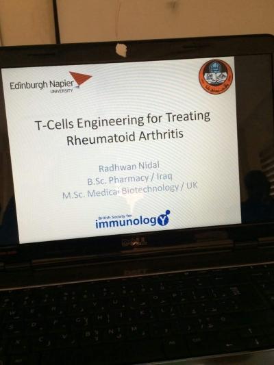 ضمن النشاطات العلمية لكليتنا للعام الدراسي 2016-2017 وتعزيزاً للمستوى العلمي والأداء الأفضل لتدريسيينا أقيم صباح يوم الإثنين الموافق 23 كانون الثاني 2017 في الموقع البديل للكلية في كركوك، سيمنار للسيد رضوان نضال، مدرس مساعد في فرع الصيدلانيات والصيدلة السريرية كلية الصيدلة والحاصل على شهادة الماجستير من جامعة أدنبره في المملكة المتحدة، عن بحثه الموسومبـT- Cell Engineering for treating Rheumatoid Arthritisوبحضور رئيس الفرع الدكتورة مي عطالله الجمال وعدد من السادة التدريسيين والمدعوين من ذوي الإختصاص.