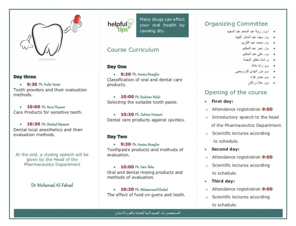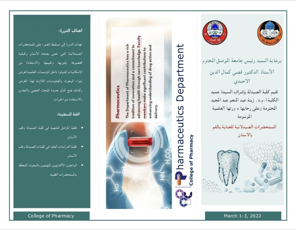 برعاية الأستاذ الدكتور قصي كمال الدين الاحمدي رئيس جامعة الموصل المحترموبإشراف مباشر من قبل الأستاذ المساعد الدكتورة زينة عبد المنعم عبد المجيد المحترمةتقيم كــــلية الصيدلة في جامعة الموصل / فرع الصيدلانياتدورة علمية بعنوان:المستحضرات الصيدلانية للعناية بالفم والاسنانوعلى قاعة السمنارات في كلية الصيدلة /جامعة الموصلتقام الورشة لمدة 3 أيام ابتداءً من يوم الثلاثاء الموافق ١ / ٣ / ٢٠٢٢ ولغاية يوم الخميس الموافق ٣ / ٣ / ٢٠٢٢علما ان الدورة مجانية والدعوة عامة للجميع