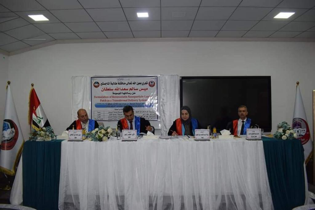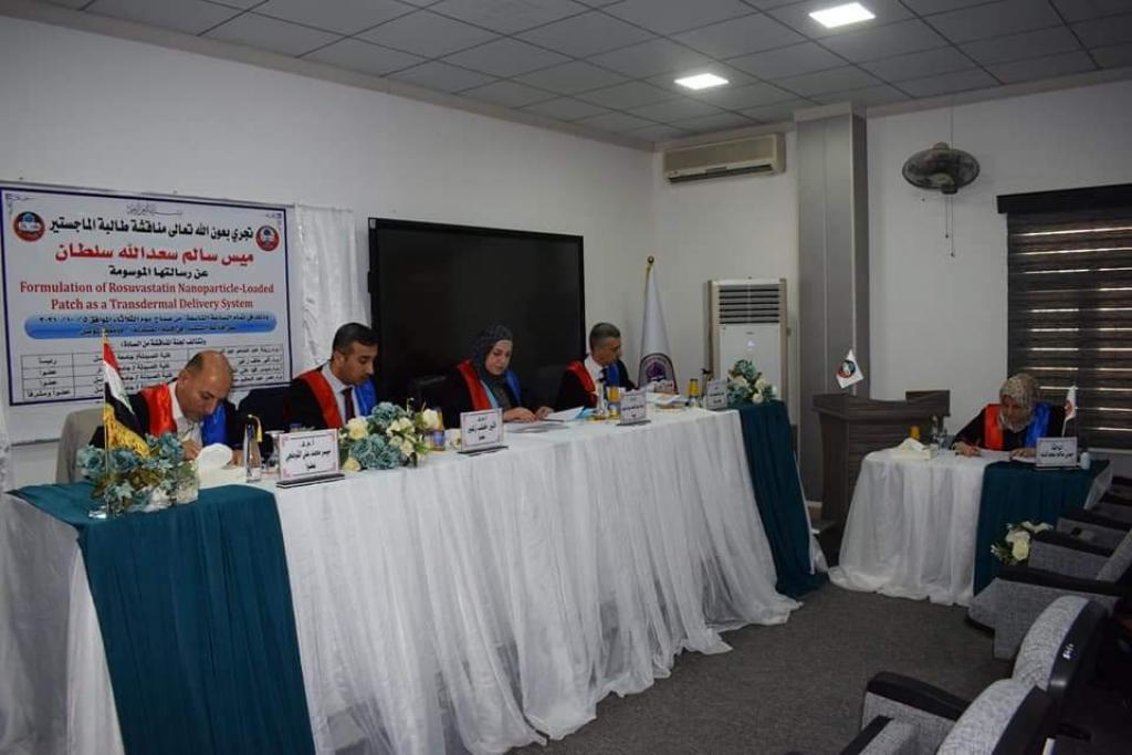 نوقشت في كلية الصيدلة صباح اليوم الثلاثاء ٥/ ١٠/ ٢٠٢١ رسالة الماجستير التي تقدمت بها الطالبة ميس سالم سعدالله و التي وسمت” صياغة رقعة محملة بالجسيمات النانوية من الروزوفاستاتين كنظام توصيل عبر الجلد”” Formulation of Rosuvastatin Nanoparticle-loaded Patch as a Transdermal Delivery system “تضمنت الدراسة محاولة إيجاد طريقة جديدة لإعطاء دواء الروسوفاستاتين المستخدم في علاج ارتفاع مستوى الدهون بالدم عن طريق الجلد باستخدام التقنية النانوية لتحسين التَوافر الحيوي للدواء في الدم.وتمكنت الباحثة من إيجاد مجموعة من الصيغ المعدلة للجرعة الدوائية للروزوفاستاتين، حيث اظهرت الصيغة المحسنة في شكل مشتت مائي استقراراً مقبولاً عند التخزين لمدة 3 أشهر في الثلاجة، كما أظهرت دراسات التحرر المختبري والنفاذية خارج الجسم الحي تحررا مضبوطًا يعتمد على الأس الهيدروجيني للروزوفاستاتين .تألفت لجنة المناقشة من كل منالسيدة عميد كلية الصيدلة/ جامعة الموصلالاستاذ المساعد الدكتورة زينة عبدالمنعم عبدالمجيد (رئيساً)والسيد عميد كلية الصيدلة /جامعة نينوى الاستاذ المساعد الدكتور ميسر محمد علي القوطجي (عضواً) والاستاذ المساعد الدكتور أثير خلف زغير (عضواً)والمدرس الدكتور عمر عبدالحكيم حامد (عضواً و مشرفاً) .وقد شهدت المناقشة حضور مجموعة من أساتذة كلية الصيدلة و جامعة الموصل و طلبة الدراسات العليا فيها.