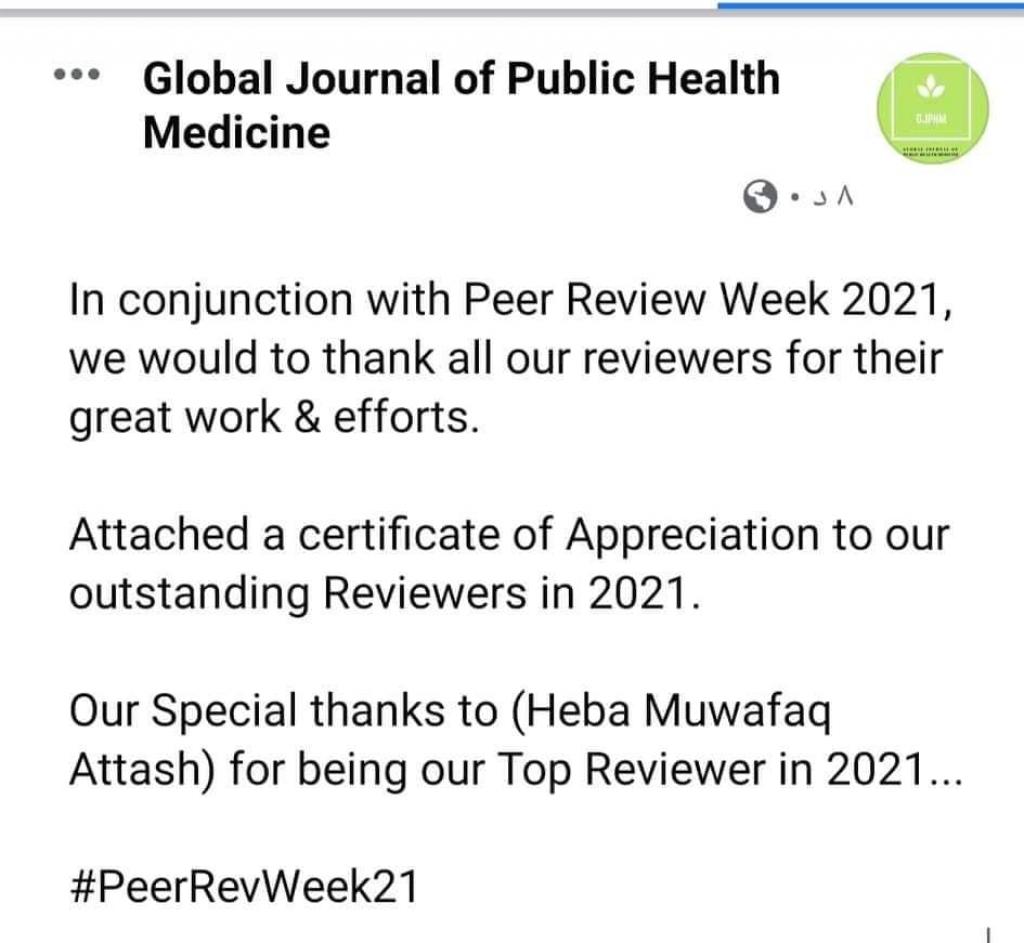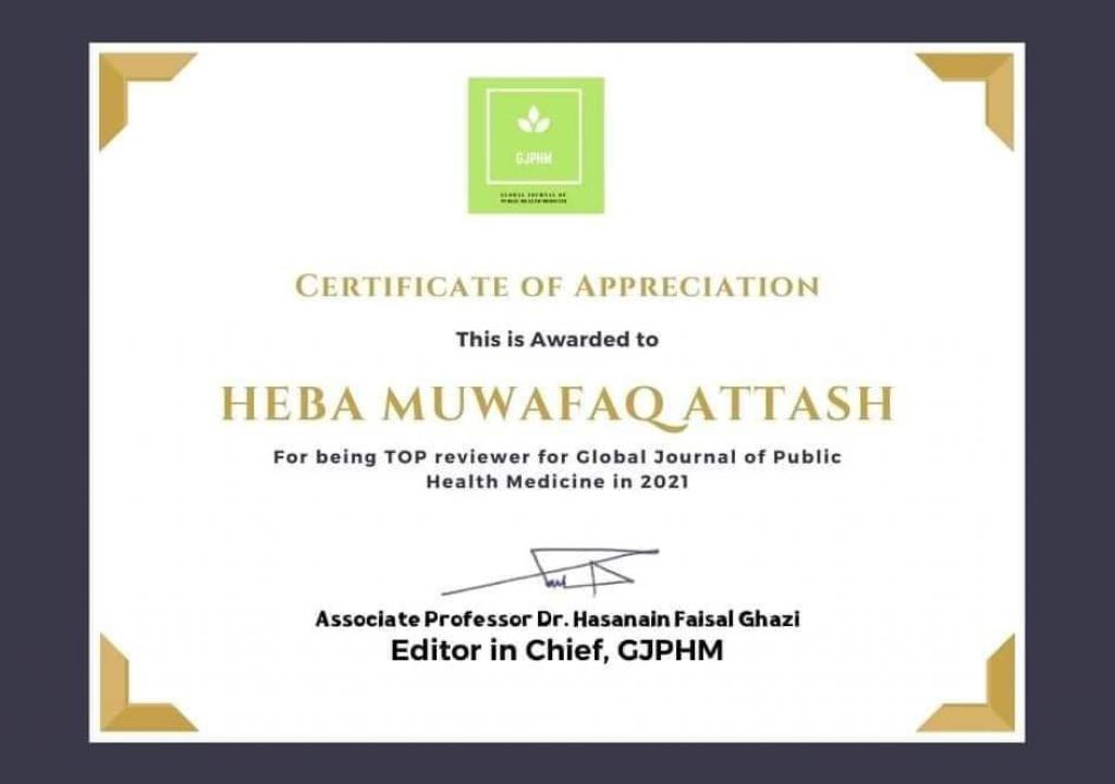 شهادة تقديرية من مجلة علمية عالمية لتدريسية في فرع الصيدلة السريرية