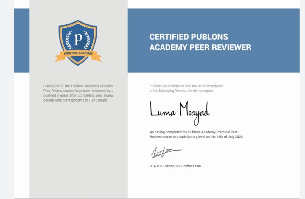 في إطار سعي أساتذة كلية الصيدلة إلى الارتقاء بالمستوى العلمي و مواكبة التطور العلمي في المؤسسات الاكاديمية العالمية حصلت الصيدلانية لمى مؤيد في فرع الصيدلة السريرية على شهادة مقيم علمي محكم من اكاديمية publons بعد اكمالها الدورة التدريبية الخاصة لأعداد مقيمين مؤهلين لتقييم البحوث العلمية.