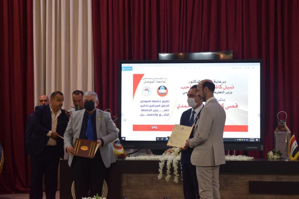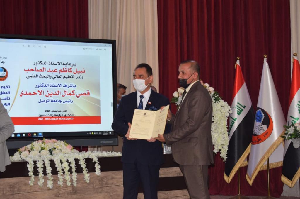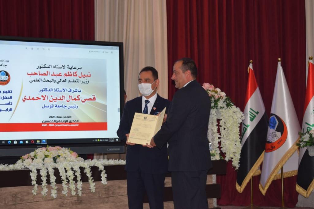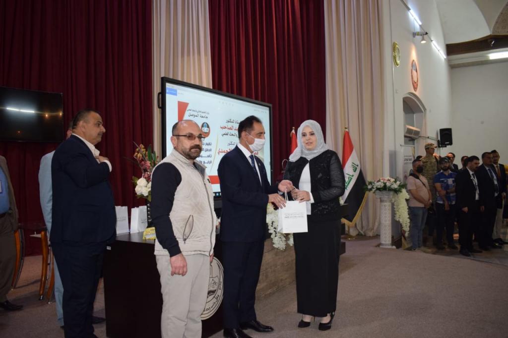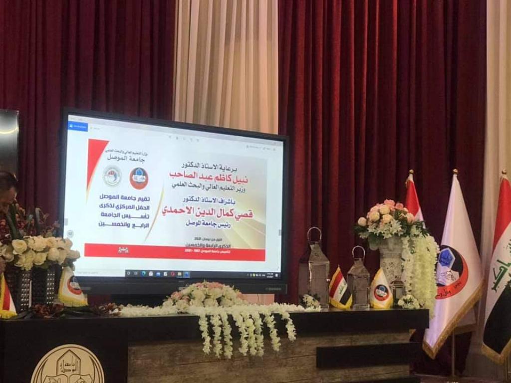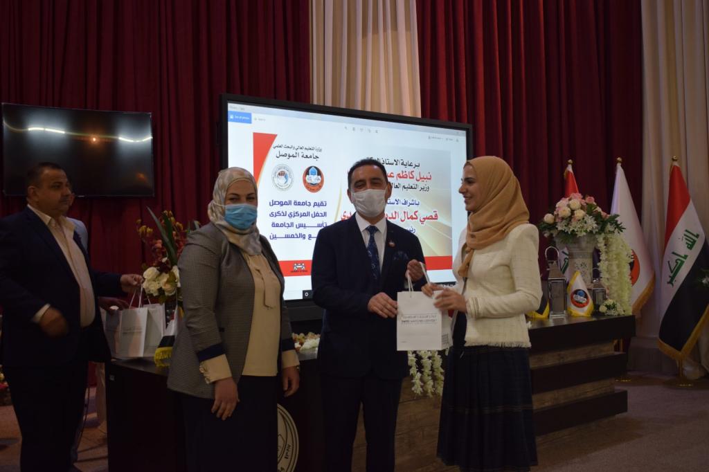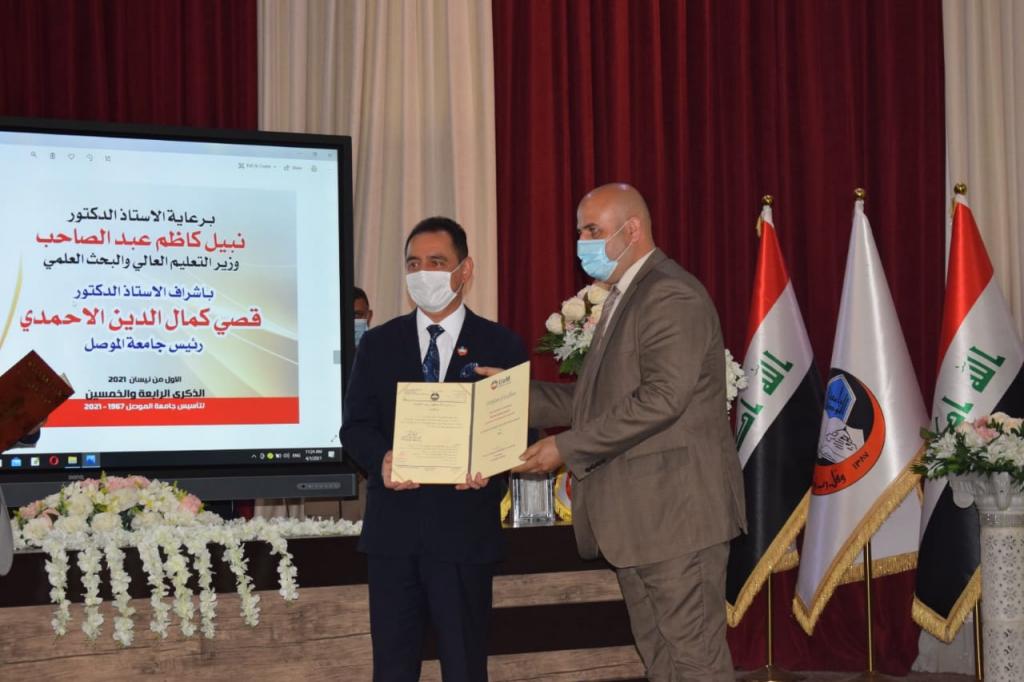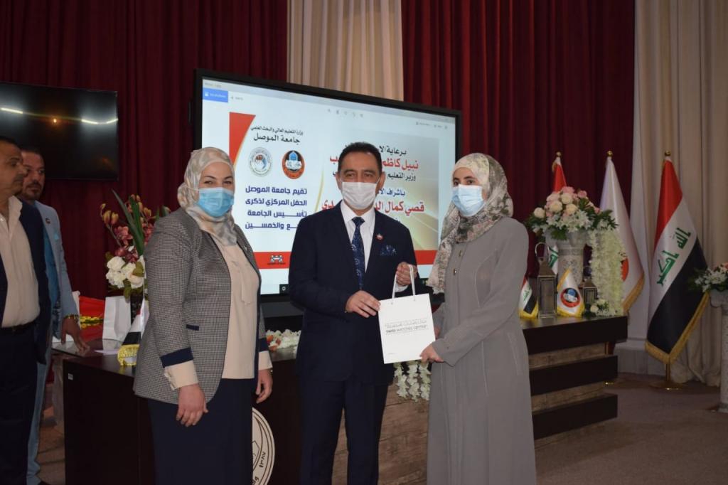 حضرت السيدة عميد كلية الصيدلة الاستاذ المساعد الدكتورة زينة عبدالمنعم عبدالمجيد المحترمة حفل العيد التأسيسي لجامعة الموصل الذي أقيم صباح اليوم الخميس ١/ ٤/ ٢٠٢١ على قاعة المنتدى العلمي و الأدبي في الجامعة.تشرف الحفل الكريم بكلمة للسيد وزير التعليم العالي والبحث العلمي الاستاذ الدكتور نبيل كاظم عبدالصاحب المحترم عبر الفضاء الإلكتروني ومن ثم كلمة للسيد محافظ نينوى السيد نجم الجبوري المحترم و السيد رئيس جامعة الموصل الاستاذ الدكتور قصي كمال الدين الاحمدي المحترم لتنطلق بعدها فعاليات الحفل من خلال ايقاد الشعلة ايذاناً بإطلاق ماراثون الجامعة الرياضي.تضمن الحفل سلسلة من الفعاليات شملت إلقاء القصائد الشعرية التي اشادت بهذا الصرح العلمي الشامخ و جرى على هامش الاحتفال تكريم كوكبة من أساتذة جامعة الموصل الأكثر نشرا للبحوث العلمية في المستوعبات الدولية لنشر الدوريات و كان لأساتذة كلية الصيدلة حضور ملفت في هذا التكريم، حيث تم تكريم كل من الدكتور ياسر فخري مصطفى والدكتور حارث خالد القزاز والدكتور محمود عكلة والدكتور معاذ قحطان بشير كما تم تكريم الطلبة الاوائل على كلية الصيدلة في الدراسات الاولية لتثبت كلية الصيدلة دورها الريادي في مجال البحث العلمي. مبروك لجامعتنا الغراء عيدها التأسيسي والى مزيدٍ من الانجازات في مسيرة العطاء العلمي المتميز.