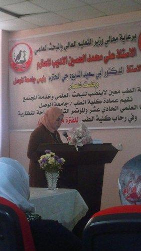 شاركت الدكتورة زينة عبدالمنعم رئيس فرع الادوية والسموم في كلية الصيدلة في المؤتمر العلمي الحادي عشر والمؤتمر الثالث للجراحة المنظارية المقام في كلية الطب جامعة الموصل للمدة من 6-7 أيار 2013 تحت شعار كلية الطب معين لاينضب للبحث العلمي وخدمة المجتمعوقد ألقت الدكتورة زينة بحث في المؤتمر تحت عنوانComparison of different sartans on uric acid levels in hypertensive patients2013/5/7 وذلك على قاعة الدراسات العليا في كلية الطب بتاريخ