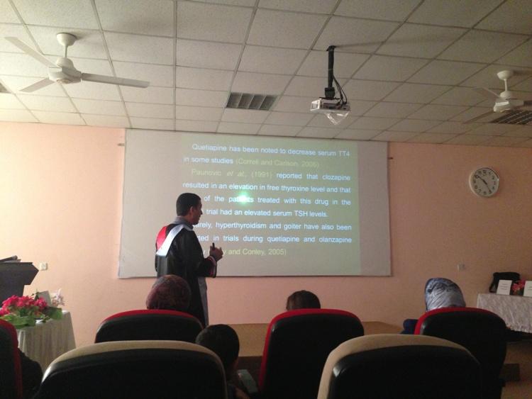 تمت في كلية الطب مناقشة طالب الدكتوراه ابراهيم محمد فيصل (التدريسي في كلية الصيدلة فرع الادوية والسموم) وذلك عن بحثه الموسوم "تاثيرات الرزبيريدون مقابل الاونزابين على السيطرة السكرية ووظائف الدرقية لدى مرضى الفصام" وذلك يوم الخميس الموافق9 كانون الثاني 2014 في الساعة العاشره صباحامن قبل اللجنةالاستاذ الدكتور باسل محمد يحيى الخياطالاستاذ الدكتور فارس عبد الموجود احمدالاستاذ الدكتور نزار احمد ناجيالاستاذة الدكتورة غادة عبد المنعم فارسالدكتور حقي محمد مجدلالاستاذ الدكتور عماد عبد الجبار ذنونالدكتور محفوظ سليمان السيدان