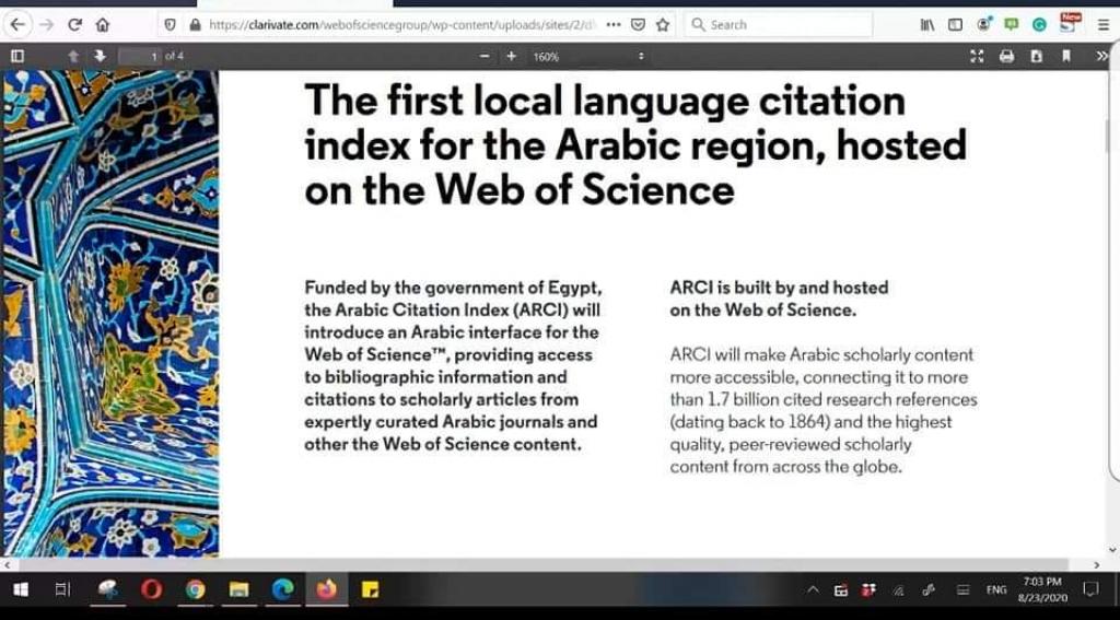 شاركت السيدة عميد كلية الصيدلة ا.م.د.زينة عبد المنعم عبد المجيد والسيد رئيس هيئة تحرير المجلة العراقية للصيدلة ا.د. فارس ذنون العبايجي اليوم الاحد الموافق ٣٠٢٠/٨/٢٣ الساعة ال٨ مساء عبر برنامج الMeet في حضور ورشة العمل حول التعرف على Arabic Citation Index (الكشّاف العربي للاستشهادات المرجعية) الذى صدر مؤخرا وبالتعاون مع مؤسسة Clarivate Analytics والخاص بالكشف عن الابحاث العربية والاستشهادات الحاصلة عليها وكيفية استفادة الباحثين من خدماته وتسويق انتاجهم العلمي .
