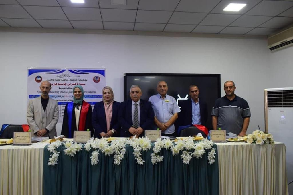 تناولت الدراسة التي تقدمت بها الطالبة سارة فراس جاسم استخدام مركب جديد قائم على النفثالين لتخليق سلسلة جديدة من مشتقات بينزو[ج]الكومارين ثلاثية التعويض، وتطرقت الى تقييم انشطتها البيولوجية خارج جسم الانسان. أظهرت النتائج أن جميع المركبات المحضرة تملك انشطة مضادة للسرطان وللأكسدة الضارة وارتفاع السكر في الدم وللميكروبات المرضية بنسب متفاوتة متعلقة بالصفات الجزيئية الخاصة بكل مركب. بالاضافة الى ذلك، فان المركبات المحضرة أظهرت صفات غير ضارة تجاه البكتريا غير المرضية والخلايا الطبيعية مع امتلاكها حركيات دوائية نظرية ترشح اعطائها عن طريق الفم. استنتجت الدراسة أن تعدد الأنشطة البيولوجية للمركبات المحضرة قد تسلط الضوء على استكشاف أدوية جديدة ذات فعاليات دوائية متعددة وسمية منخفضة.