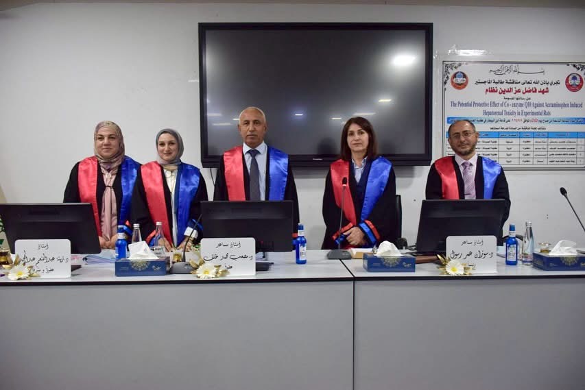 اجري يوم الثلاثاء الموافق 9 ايلول 2025 وفي رحاب قاعة ابن البيطار في كلية الصيدلة مناقشة رسالة الماجستير للطالبة شهد فاضل عز الدين نظام ،