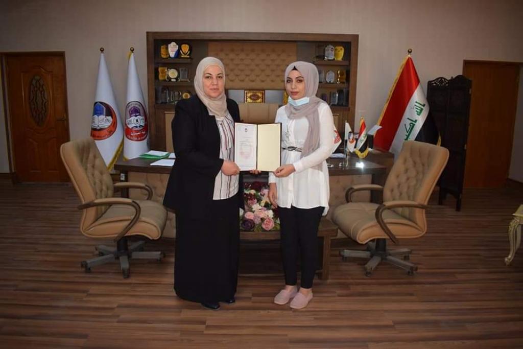 منحت السيدة عميد كلية الصيدلة الاستاذ المساعد الدكتورة زينة عبدالمنعم عبدالمجيد اليوم الاحد الموافق ٢٠٢١/٤/١٨ كتاب شكر وتقدير للطالبة في المرحلة الرابعة شهد مؤيد احمد النعيمي وذلك لاكتشافها خطأ في احد المصادر العلمية المعتمدة في مادة الصيدلانيات في المرحلة الرابعة