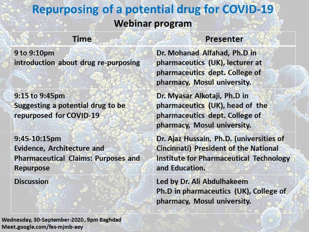 ندوة علمية في فرع الصيدلانياتبرعاية السيد رئيس جامعة الموصل الاستاذ الدكتور قصي كمال الدين الاحمدي المحترم و بأشراف السيدة عميد كلية الصيدلة الأستاذ المساعد الدكتورة زينة عبدالمنعم عبدالمجيد المحترمة يقيم فرع الصيدلانيات في كلية الصيدلة – جامعة الموصل و بالتعاون مع مركز اليقظة الدوائية في وزارة الصحة ندوة علمية بعنوان”Repurposing of Potential Drugs for Covid-19″وذلك في تمام الساعة التاسعة من مساء يوم الاربعاء ٣٠/ ٩/ ٢٠٢٠ وعبر برنامج meetتستضيف الندوة البروفيسور آجاز حسين الاستاذ في جامعة Long Island و عضو منظمة الغذاء والدواء العالمية FDA.يمكنكم حضور الندوة من خلال الرابط :meet.google.com/fes-mjmb-aeyللإطلاع على منهاج الندوة يرجى النظر في الملفات المرفقة.
