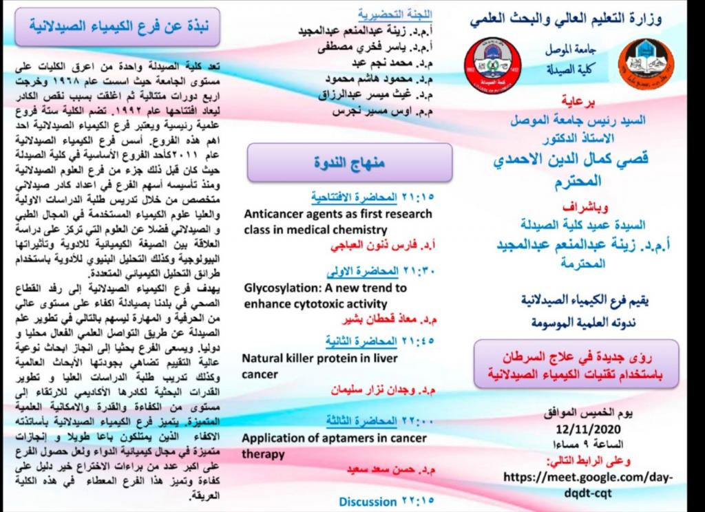 ندوة علمية في كلية الصيدلةبرعاية السيد رئيس جامعة الموصل الاستاذ الدكتور قصي كمال الدين الاحمدي المحترم و بأشراف مباشر من السيدة عميد كلية الصيدلة المحترمة الأستاذ المساعد الدكتورة زينة عبدالمنعم عبدالمجيد المحترمة يقيم فرع الكيمياء الصيدلانية ندوة علمية افتراضية باستخدام تطبيق Googl meet تحت عنوان “رؤى جديدة في علاج السرطان باستخدام تقنيات الكيمياء الصيدلانية” وذلك في يوم الخميس الموافق ١٢/ ١١/ ٢٠٢٠.رابط حضور الندوة :http://meet.google.com/day-dqdt-cqt