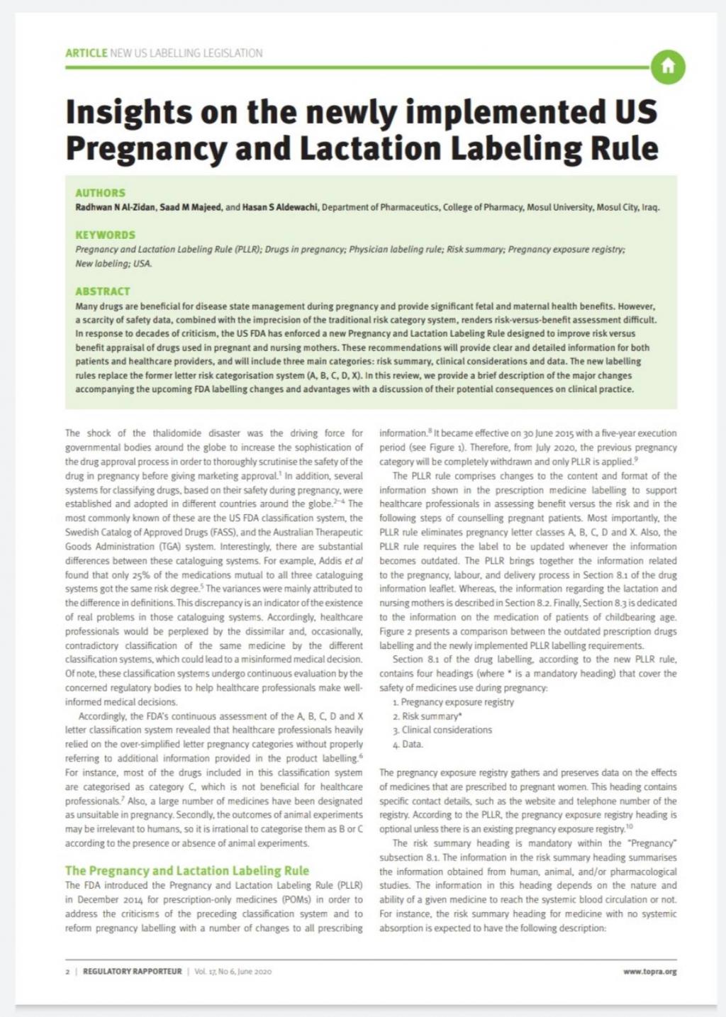 نشرت مجلة Regulatory Rapporteur البريطانية بحثا مشتركا للمدرس المساعد رضوان نضال مع م.م. سعد محمد و م.د. حسن سعد (التدريسيين في كلية الصيدلة/جامعة الموصل) والذي جاء تحت عنوان:Insights on the newly implemented US Pregnancy and Lactation Labeling Ruleوتناول البحث التغييرات الأخيرة التي اقرتها منظمة الغذاء والدواء الأمريكية FDA من ناحية تصنيف الادوية خلال فترة الحمل ضمن ما يعرف بقانون Pregnancy and Lactation Labelling Rule (PLLR) الجديد والذي بدوره الغى التصنيف القديم للأدوية خلال فترة الحمل والرضاعة. من الجدير بالذكر ان التصنيف الملغى قد استخدم على مدار العقود الأربعة الأخيرة في معظم البلدان حول العالم ومن ضمنها العراق.وتطرق البحث أيضا الى التأثيرات المتوقعة لتطبيق قانون ال PLLR على قرارات الأطباء في استخدام الادوية خلال فترة الحمل والرضاعة, وضرورة تعريف الكوادر الصحية من أطباء وصيادلة على التغييرات الأخيرة على التي جلبها قانون ال PLLR.https://www.topra.org/TOPRA/TOPRA_Member/REGRAP/Public/Regulatory_Rapporteur_Issue_Detail_Public.aspx?IssueID=524051&ID=57221
