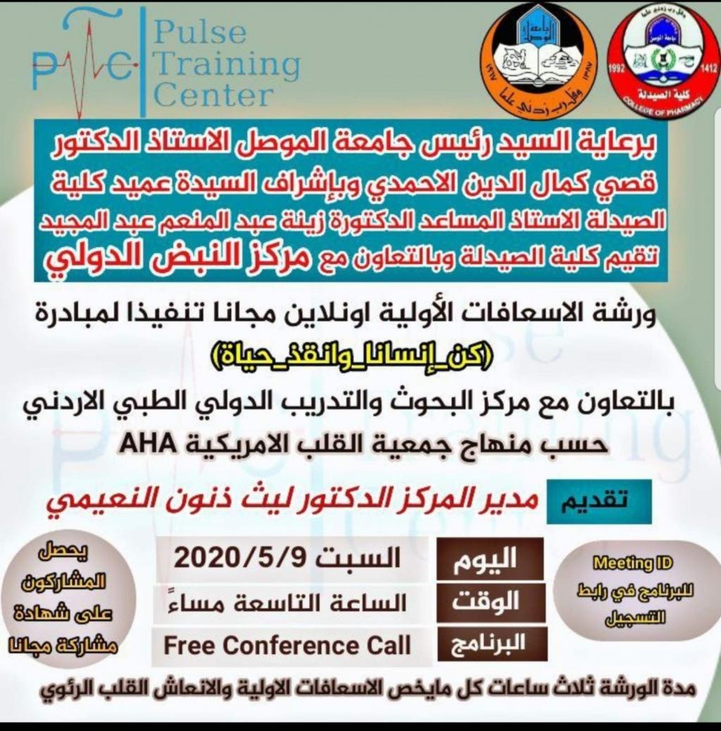 برعاية السيد رئيس جامعة الموصل الاستاذ الدكتور قصي كمال الدين الاحمدي وباشراف السيدة عميد كلية الصيدلة الاستاذ المساعد الدكتورة زينة عبدالمنعم عبدالمجيد تقيم كلية الصيدلة وبالتعاون مع مركز النبض للتدريب والتطوير الطبي ورشة إلكترونية في الاسعافات الاولية على تطبيق (FCC) تنفيذا لمبادرة “كن انسانا وانقذ حياة” وحسب منهاج جمعية القلب الامريكية AHA-هدف المبادرة زرع منقذ في كل بيتوذلك في يوم السبت 2020-5-9 في الساعة 9:00 مساء.مدة الورشة ساعتان الى ثلاث ساعاتتقديم د.ليث ذنون النعيمي مدير المركزللتسجيل والمزيد من المعلومات في الرابط ادناه:https://forms.gle/K6gZ1tnHgrowWeyj9