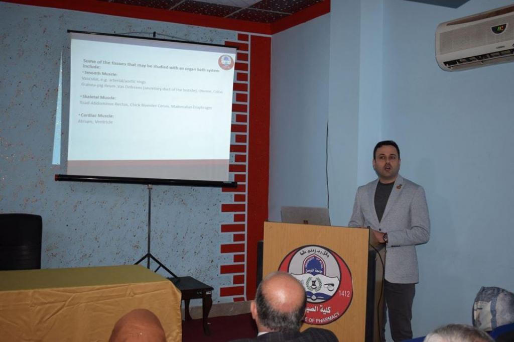 م. د. مصعب محمد خلف للترحيب بالحضور الندوة ومن ثم بدأت المحاضرات العلمية التي ألقاها أساتذة فرع الادوية عن جهاز حمام الأعضاء المعزولة و تطبيقاته في البحوث الطبية و الصيدلانية وتلى ذلك تطبيق عملي تناول آلية عمل الجهاز و كيفية ربط الأنسجة المختلفة و معاملتها بالأدوية المختلفة و مراقبة استجابات الأعضاء المعزولة الناتجة عن تعرض الأنسجة لمفعول الادوية. كما عرضت بعض الملصقات التي توضع آلية عمل الجهاز و أمثلة عن التجارب العلمية التي يستخدم فيها الجهاز. وقد حضر ورشة العمل السيد وكيل عميد كلية الصيدلة المحترم والسيد معاون العميد للشؤون العلمية المحترم و جمع غفير من الاساتذة والباحثين في جامعة الموصل والذين أبدوا تقديرهم العالي لهذا الجهد العلمي المتميز..
