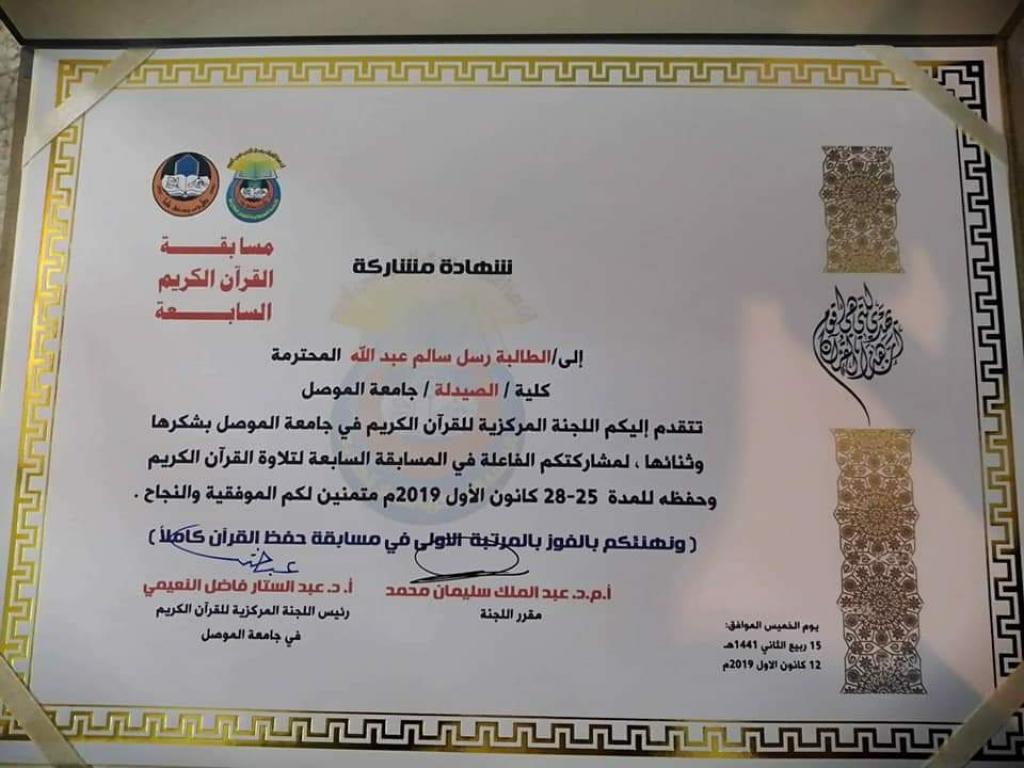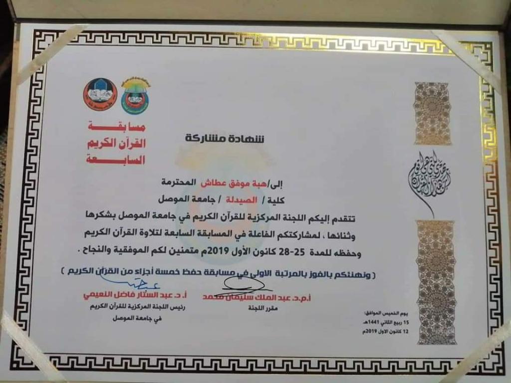 كلية الصيدلة تحصد جوائز مسابقة حفظ و تلاوة القرأن في جامعة الموصل