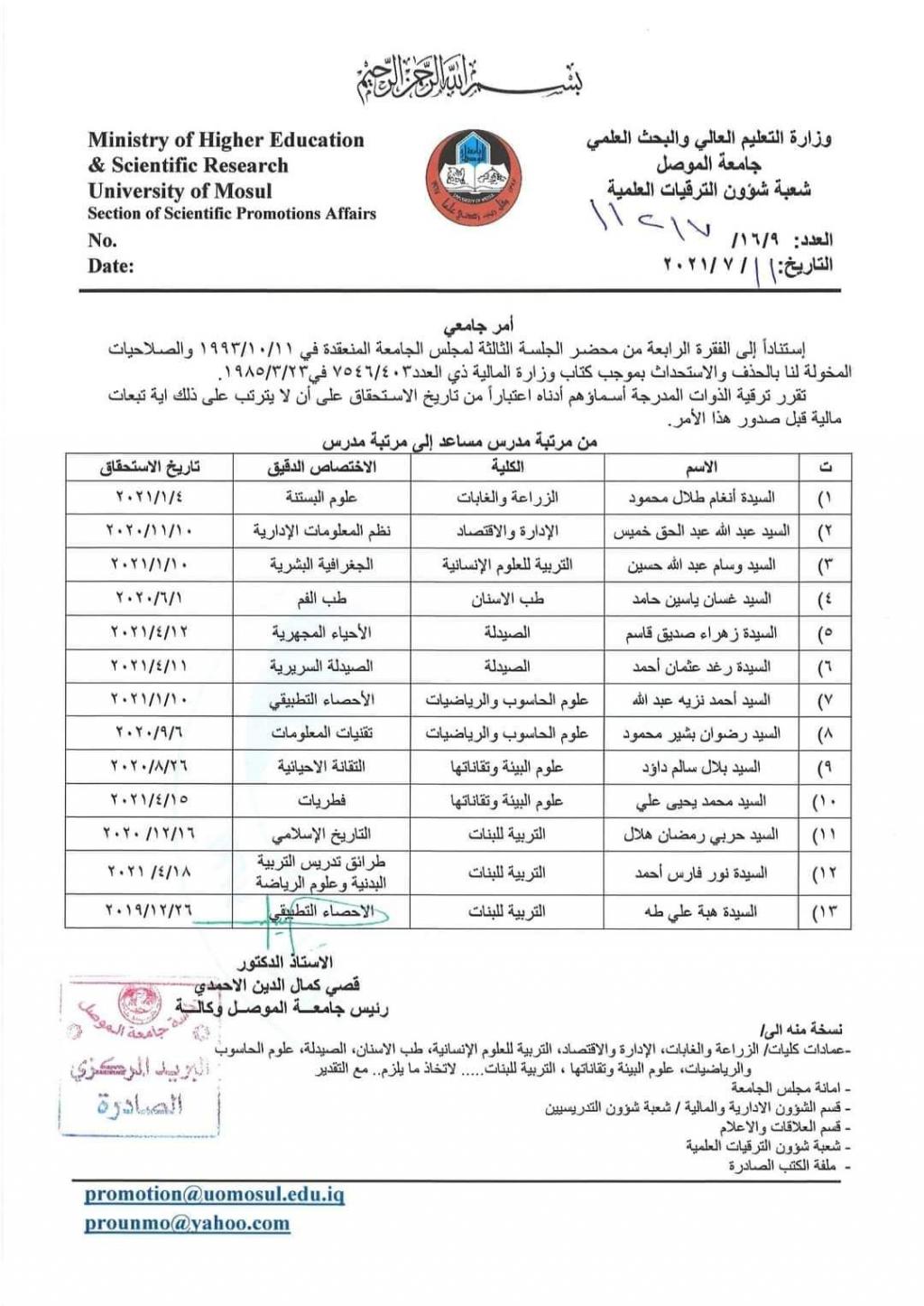 تتقدم عمادة ومنتسبي كلية الصيدلة متمثلة بالسيدة عميد الكلية الاستاذ المساعد الدكتورة زينة عبد المنعم عبد المجيد بالتهنئة لكل من السيدات زهراء صديق قاسم ورغد عثمان احمد بمناسبة ترقيتهما العلمية الى مرتبة مدرس متمنين لهم المزيد من التقدم والعطاء..