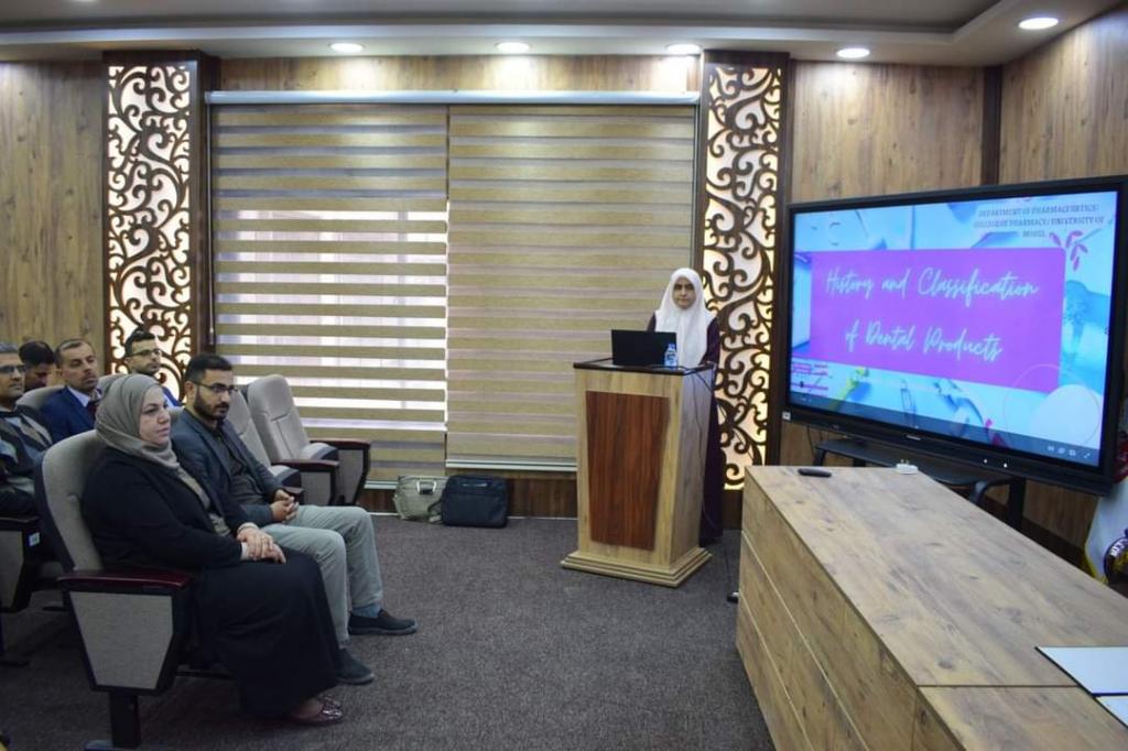 دورة عن المستحضرات الصيدلانية للعناية بالفم والاسنانبرعاية الأستاذ الدكتور قصي كمال الدين الاحمدي رئيس جامعة الموصل المحترموبإشراف مباشر من قبل عميد كلية الصيدلة الأستاذ المساعد الدكتورة زينة عبد المنعم عبد المجيد المحترمةاقيمت في كــــلية الصيدلة صباح هذا اليوم الثلاثاء الموافق ١ / ٣ / ٢٠٢٢ الدورة العلمية الموسومة:”المستحضرات الصيدلانية للعناية بالفم والاسنان”التي ينضمها فرع الصيدلانيات على قاعة السمنارات.تضمنت فعاليات اليوم الاول للدورة المحاضرات التالية:١. تصنيف منتجات العناية بالفم والأسنان. قدمتها م. آمنة مظفر٢. اختيار معجون الأسنان المناسب. قدمها م. رضوان نضال٣. منتجات العناية بالأسنان ضد التسوس. قدمتها م.م. زهراء حسينومن الجدير بالذكر ان الدورة تستمر لمدة ثلاثة ايام ولغاية يوم الخميس الموافق ٣ / ٣ / ٢٠٢٢تمنياتنا لجميع المشاركين بالموفقية وتحقيق اقصى استفادة علمية.