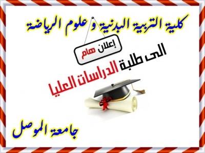 أعلان ….. على كافة الطلبة المقبولين في الدراسات العليا الماجستير والدكتوراه للعام الدراسي 2018/2017 مراجعة الكلية الدراسات العليا لأمور تتعلق بدراستهم وبالسرعة الممكنةعمادة كلية التربية البدنية وعلوم الرياضة