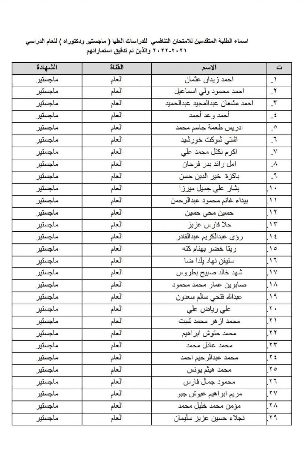 اعلان الى الطلبة المتقدمين للدراسات العليا ( الماجستير والدكتوراه ) للعام الدراسي ۲۰۲۲/۲۰۲۱