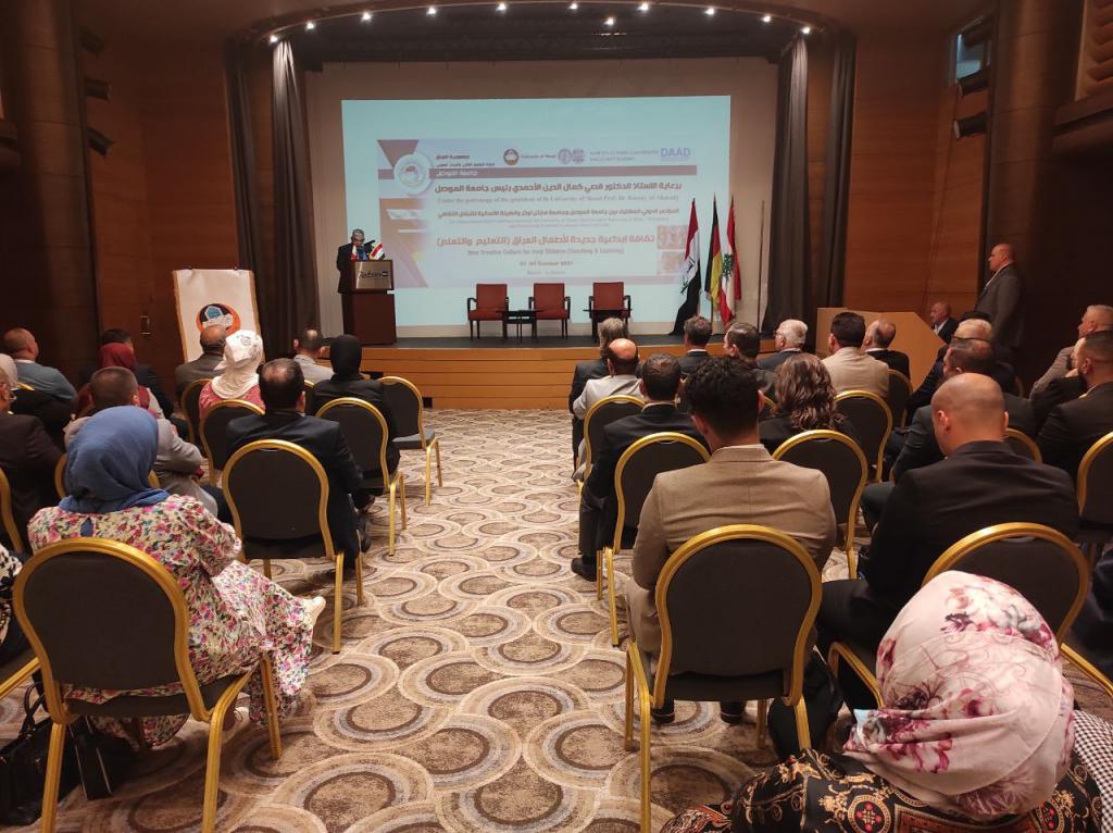 برعاية الاستاذ الدكتور قصي كمال الدين الاحمدي وبالتعاون مع الهيئة الالمانية DAAD وجامعة مارتن لوثرانطلقت اليوم الجمعة 1 تشرين الاول 2021، أعمال المؤتمر الدولي المشترك بين جامعة الموصل وجامعة مارتن لوثر والهيئة الالمانية للتبادل الثقافي(DAAD) تحت عنوان( ثقافة ابداعية جديدة لأطفال العراق – التعليم والتعلم ) للمدة من 1-4 تشرين الاول 2021 في العاصمة اللبنانية بيروت. ضم الوفد المشارك من كليتنا الاستاذ الدكتور احمد حامد السويدي عميد كلية التربية البدنية وعلوم الرياضة عضو اللجنة العليا للمؤتمر وعدد من اساتذة كليتنا القائمين على اعمال المؤتمر من أعضاء لجان وباحثين ومتحدثين ومشاركين.يهدف المؤتمر الى التنسيق والتعاون الدولي بين الجامعات العراقية والجامعات والمنظمات الدولية للتصدي للمشكلات التعليمية والتدريسية لأطفال العراق من خلال تخصصات علمية مختلفة و متابعة الاساليب والخبرات العلمية الحديثة في معالجة الازمات النفسية للأطفال وتأثيرها على واقع التربية والتعليم في العراق .كما يهدف الى ِ مراجعة حقوق الاطفال في التعليم والتعلم وتوفير سبل الحماية المجتمعية لهم وتطوير اساليب التدريس والتعليم على وفق المناهج العلمية الحديثة والافادة من خبرات النجاح لدى الدول المتقدمة وتطوير الرياضة المدرسية والتركيز على دورها في انضاج افكار الاطفال وتحديد دورهم الاجتماعي في المجتمع فضلاً عن اعتماد مبدأ التنوع العلمي في التخصصات الانسانية والرياضية لمعالجة مشاكل الاطفال والوصول الى الحلول اللازمة .تضمنت محاور المؤتمر مواضيع عن حقوق الاطفال والحماية المجتمعية خصوصاً ذوي الاحتياجات الخاصة في العراق وعن الاضطرابات النفسية للأطفال نتيجة للأزمات والحروب وصعوبات التعلم وسبل مواجهتها وتأثير التربية البدنية والاجتماعية على سلوك الاطفال ودور الرياضة المدرسية في تنمية قدراتهم ومواهبهم ، وعمالة الاطفال وتأثيرها على تدني مستواهم التعليمي فضلا عن دور التحول الرقمي في نظام التعليم العراقي .