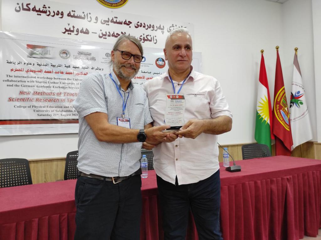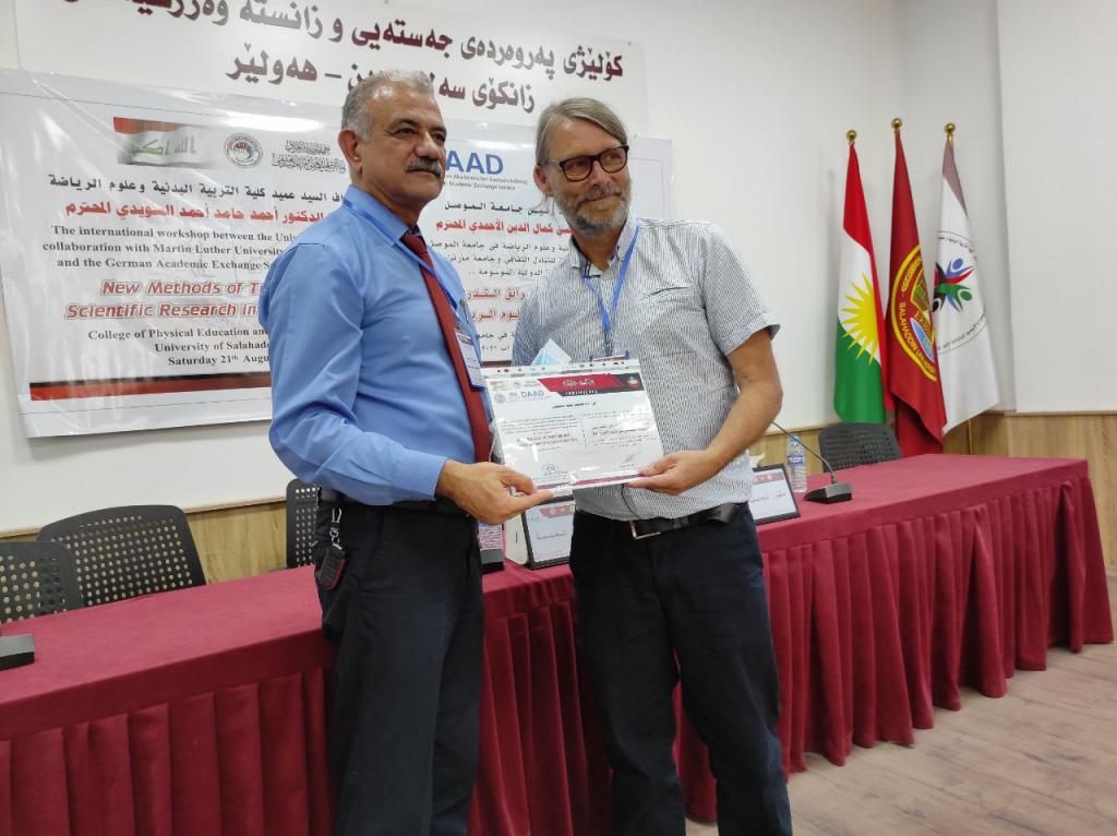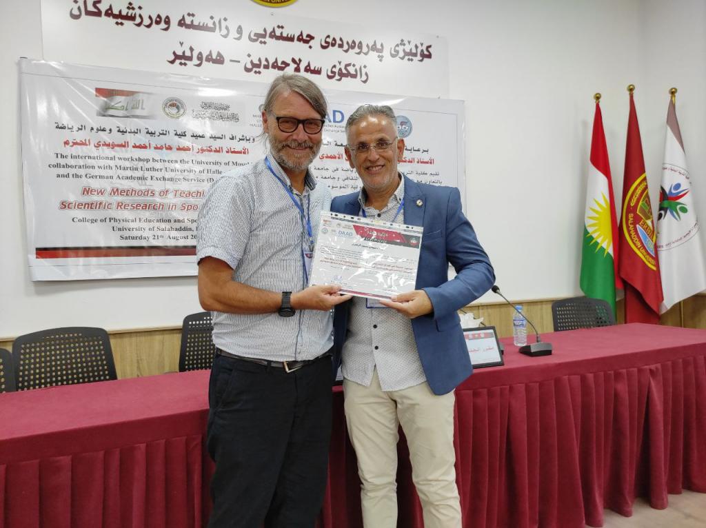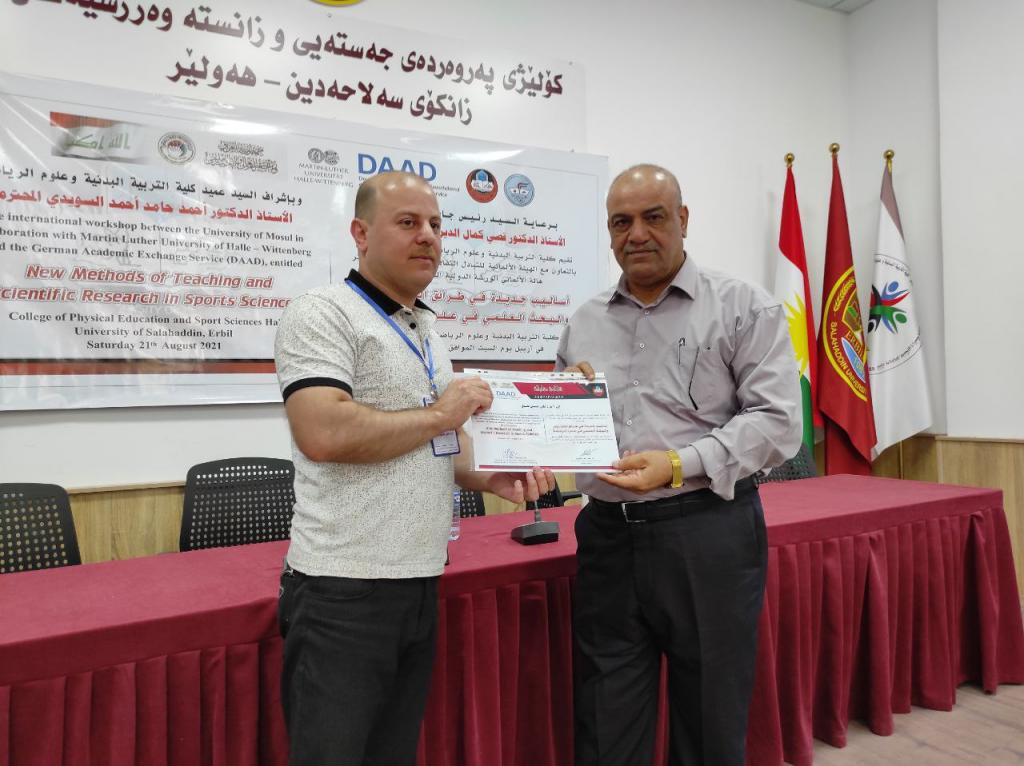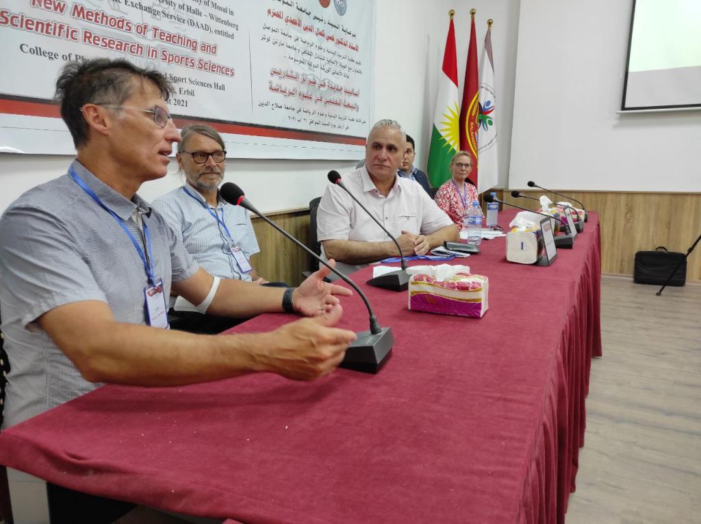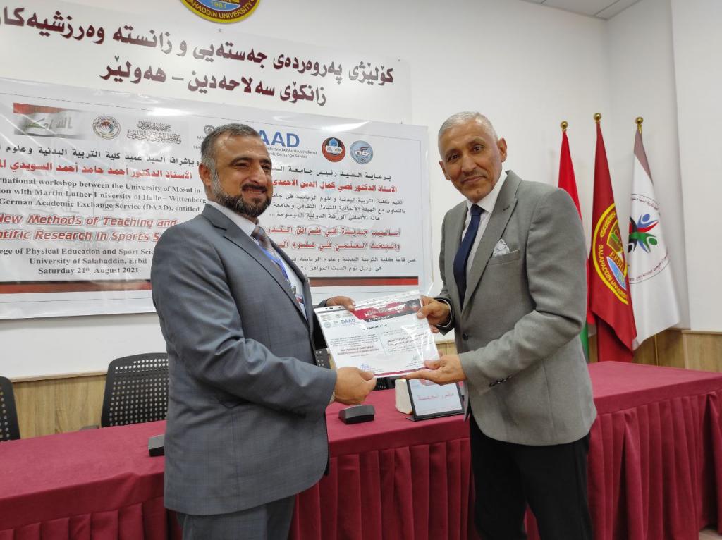 برعاية السيد رئيس جامعة الموصلالأستاذ الدكتور قصي كمال الدين الأحمديوبإشراف السيد عميد كلية التربية البدنية وعلوم الرياضةالأستاذ الدكتور أحمد حامد أحمد السويدياقامت كلية التربية البدنية وعلوم الرياضة الورشة الدوليةأساليب جديدة في طرائق التدريس والبحث العلمي في علوم الرياضةوالتي نظمتها الكلية بالتعاون مع الهيئة الألمانية للتبادل الثقافي وجامعة مارتن لوثر هالة الألمانية في رحاب جامعة صلاح الدين كلية التربية البدنية وعلوم الرياضة.تضمنت الورشة مناقشات علمية حول تطوير طرائق التدريس وأساليب البحث العلمي في علوم الرياضة فضلا عن توسيع آفاق التعاون العلمي معالجامعات الألمانية.هدفت الورشة إلى:الإطلاع على كل ما هو جديد في البرامج العلمية الخاصة بطرائق تدريس التربية البدنية وعلوم الرياضة والبحث العلمي.تقويم البرامج والمناهج لطرائق التدريس والبحث العلمي للوقوف على نقاط القوة والضعف فيها ومحاولة علاجها وتعديلها وتطويرها.تحديد الخطط الإستراتيجية لتطوير وتحسين الأداء وجودة طرق التدريس والبحث العلمي والدراسات العليا.إدامة التعاون بين جامعة الموصل – كلية التربية البدنية وعلوم الرياضة والهيئة الألمانية للتبادل الثقافي وجامعة مارتن لوثر هالة الألمانية من خلال إقامة الورش والندوات والمؤتمرات التدريسيين وطلبة الدراسات العليا والباحثين الشباب .استحداث شبكة من الباحثين والأكاديميين بين ألمانيا والجامعات العراقية.المشاركون:البروفيسور أوليفر شتولجامعة مارتن لوثر – ألمانياأ.د صفاء ذنون اسماعيل الإمامجامعة الموصل – العراقالبروفيسور رالف براندجامعة بوتسدام – ألمانياالبروفيسور سوزانا ننينبيرغجامعة مارتن لوثر – ألمانياأ.د ثيلام يونس علاويجامعة الموصل – العراقالدكتور عمرو سعدجامعة مارتن لوثر – ألمانياترأس الجلسة الاولى الاستاذ الدكتور ناظم شاكر ومقرر الجلسة الاستاذ الدكتورة صفاء ذنونشملت الجلسة الاولى ثلاث محاضراتالمحاضرة الأولىتاثير المشاعر في الرياضة والتمارين الرياضية .الأساس النظرية والقياس prof Dr. Ralf Brandtالمحاضرة الثانيةالمواجهة الذاتية بالفديو أداة تشخيصية لتقييم الادراك في هذه العملية prof. Dr. oliver stollالمحاضرة الثالثةرياضة بدون تدريب ومنافسة – هل يستحق كل هذا العناء؟ prof. Dr. Susanne Dannenbergفي حين ترأس الجلسة الثانية الاستاذ الدكتور هاشم احمد سليمان ومقررا الاستاذ الدكتور اياد محمد شيتالمحاضرة الأولى :(ممارسات متداولة في بحوث التربية البدنية وعلوم الرياضة)أ.د ثيلام يونس علاويالمحاضرة الثانية :(دور التعليم المدمج في تدريس مهارات التربية البدنية)أ.د صفاء ذنون إسماعيل الإمامالمحاضرة الثالثة :(التعليم المتنقل إستراتيجية حديثة للتعليم في ظل جائحة كورونا)أ.د أفراح ذنون يونس – أ.د جاسم محمد نايف الروميالمحاضرة الرابعة :(استخدام برنامج سكامبر في تعليم مفاهيم طرائق تدريس التربية الرياضية) أ.د أياد محمد شيت ‏ أ.م.د جمال شكري بسيمالمحاضرة الخامسة :(الاستلال العلمي ‏ الإنتحال) أ.د جاسم محمد نايف الروميالمحاضرة السادسة :(نموذج بحثي لتصميم استمارة استبيان لدور الآباء في تشجيع الأبناء على الممارسة الرياضية) أ.د رياض احمد إسماعيل