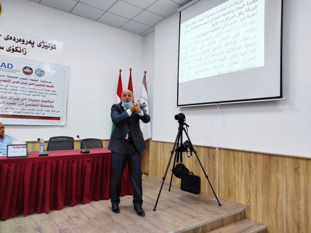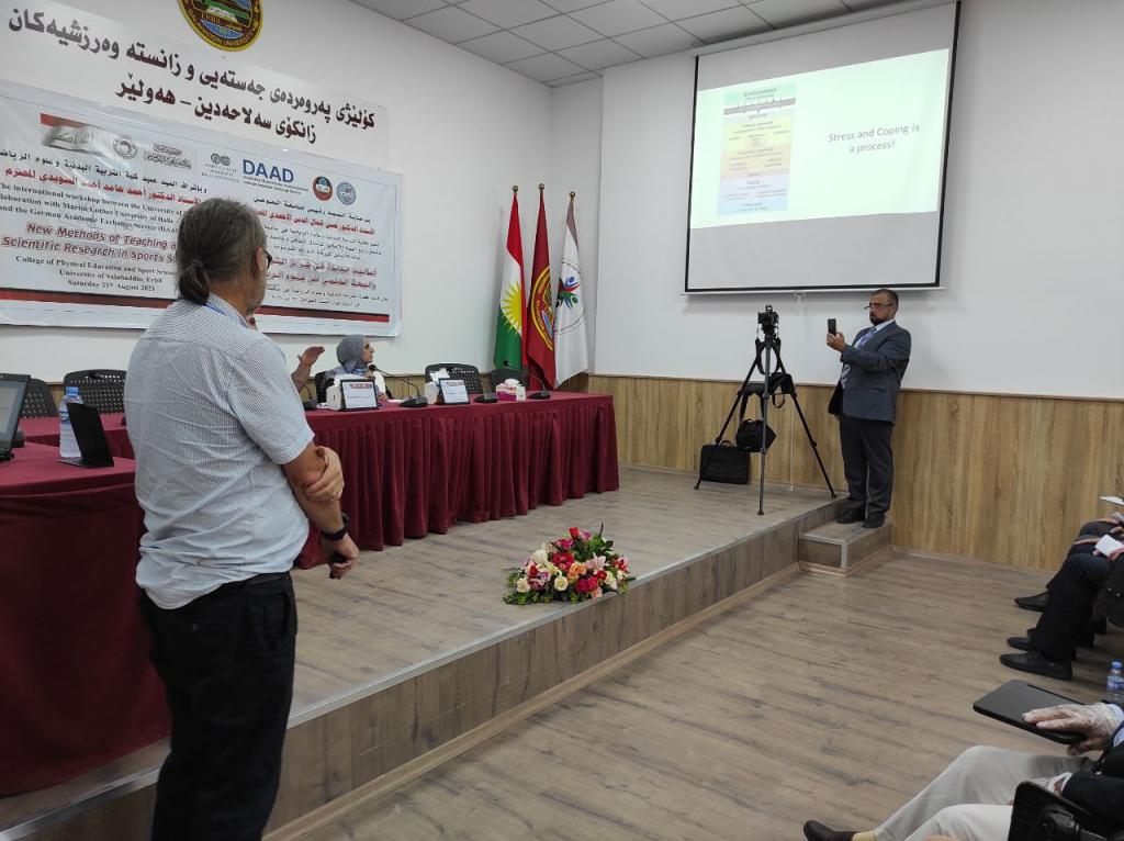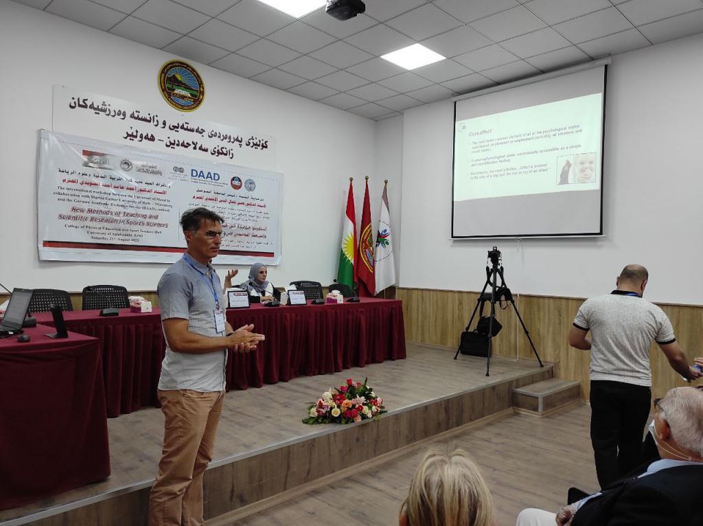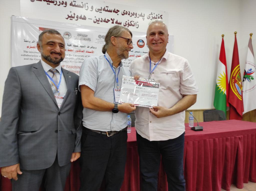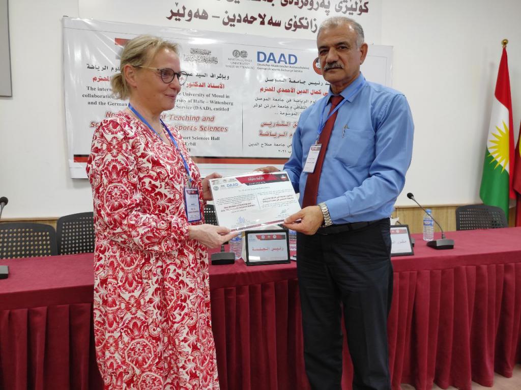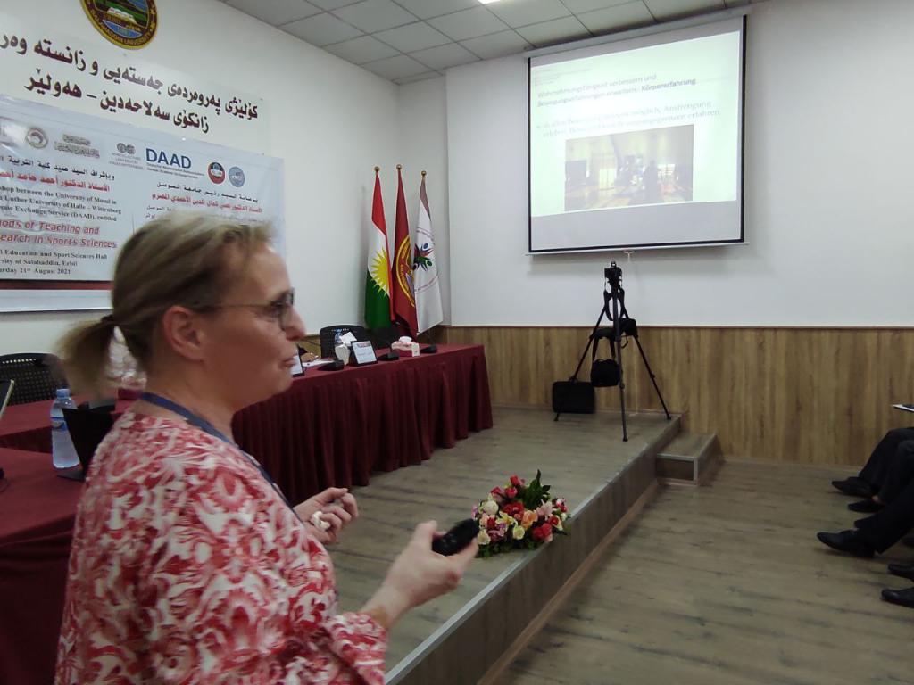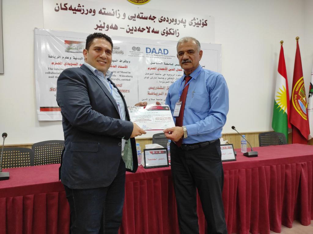 برعاية السيد رئيس جامعة الموصلالأستاذ الدكتور قصي كمال الدين الأحمديوبإشراف السيد عميد كلية التربية البدنية وعلوم الرياضةالأستاذ الدكتور أحمد حامد أحمد السويدياقامت كلية التربية البدنية وعلوم الرياضة الورشة الدوليةأساليب جديدة في طرائق التدريس والبحث العلمي في علوم الرياضةوالتي نظمتها الكلية بالتعاون مع الهيئة الألمانية للتبادل الثقافي وجامعة مارتن لوثر هالة الألمانية في رحاب جامعة صلاح الدين كلية التربية البدنية وعلوم الرياضة.تضمنت الورشة مناقشات علمية حول تطوير طرائق التدريس وأساليب البحث العلمي في علوم الرياضة فضلا عن توسيع آفاق التعاون العلمي معالجامعات الألمانية.هدفت الورشة إلى:الإطلاع على كل ما هو جديد في البرامج العلمية الخاصة بطرائق تدريس التربية البدنية وعلوم الرياضة والبحث العلمي.تقويم البرامج والمناهج لطرائق التدريس والبحث العلمي للوقوف على نقاط القوة والضعف فيها ومحاولة علاجها وتعديلها وتطويرها.تحديد الخطط الإستراتيجية لتطوير وتحسين الأداء وجودة طرق التدريس والبحث العلمي والدراسات العليا.إدامة التعاون بين جامعة الموصل – كلية التربية البدنية وعلوم الرياضة والهيئة الألمانية للتبادل الثقافي وجامعة مارتن لوثر هالة الألمانية من خلال إقامة الورش والندوات والمؤتمرات التدريسيين وطلبة الدراسات العليا والباحثين الشباب .استحداث شبكة من الباحثين والأكاديميين بين ألمانيا والجامعات العراقية.المشاركون:البروفيسور أوليفر شتولجامعة مارتن لوثر – ألمانياأ.د صفاء ذنون اسماعيل الإمامجامعة الموصل – العراقالبروفيسور رالف براندجامعة بوتسدام – ألمانياالبروفيسور سوزانا ننينبيرغجامعة مارتن لوثر – ألمانياأ.د ثيلام يونس علاويجامعة الموصل – العراقالدكتور عمرو سعدجامعة مارتن لوثر – ألمانياترأس الجلسة الاولى الاستاذ الدكتور ناظم شاكر ومقرر الجلسة الاستاذ الدكتورة صفاء ذنونشملت الجلسة الاولى ثلاث محاضراتالمحاضرة الأولىتاثير المشاعر في الرياضة والتمارين الرياضية .الأساس النظرية والقياس prof Dr. Ralf Brandtالمحاضرة الثانيةالمواجهة الذاتية بالفديو أداة تشخيصية لتقييم الادراك في هذه العملية prof. Dr. oliver stollالمحاضرة الثالثةرياضة بدون تدريب ومنافسة – هل يستحق كل هذا العناء؟ prof. Dr. Susanne Dannenbergفي حين ترأس الجلسة الثانية الاستاذ الدكتور هاشم احمد سليمان ومقررا الاستاذ الدكتور اياد محمد شيتالمحاضرة الأولى :(ممارسات متداولة في بحوث التربية البدنية وعلوم الرياضة)أ.د ثيلام يونس علاويالمحاضرة الثانية :(دور التعليم المدمج في تدريس مهارات التربية البدنية)أ.د صفاء ذنون إسماعيل الإمامالمحاضرة الثالثة :(التعليم المتنقل إستراتيجية حديثة للتعليم في ظل جائحة كورونا)أ.د أفراح ذنون يونس – أ.د جاسم محمد نايف الروميالمحاضرة الرابعة :(استخدام برنامج سكامبر في تعليم مفاهيم طرائق تدريس التربية الرياضية) أ.د أياد محمد شيت ‏ أ.م.د جمال شكري بسيمالمحاضرة الخامسة :(الاستلال العلمي ‏ الإنتحال) أ.د جاسم محمد نايف الروميالمحاضرة السادسة :(نموذج بحثي لتصميم استمارة استبيان لدور الآباء في تشجيع الأبناء على الممارسة الرياضية) أ.د رياض احمد إسماعيل