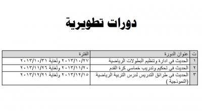 تنظم كلية التربية الرياضية وحدة التعليم المستمر دورات تطويرية في الجدول المرفق وحسب عنوان وتاريخ كل دورة راجين اعلامنا باسماء مرشحبكم عن كل دورة على ان تصلنا الاسماء موعد اقصاه 2013/10/24 علما ان اجور الاشتراك في كل دورة عشرة الاف دينار تسدد مع قائمة المشاركين للتعليم المستمر في الكلية ويمنح المشاركين شهادات مشاركة معتمدة من الكلية.