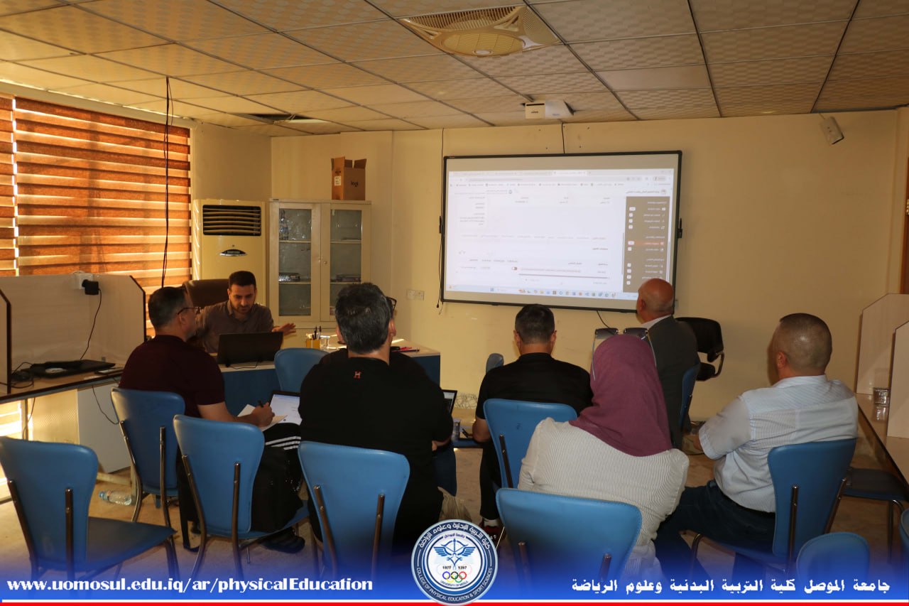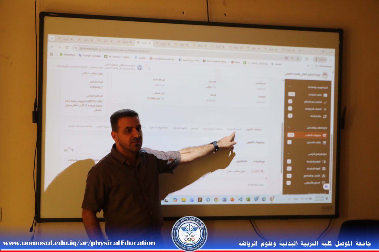 أقامت كلية التربية البدنية وعلوم الرياضة اليوم الاحد الموافق 2 تشرين الثاني 2025 دورة تدريبية خاصة حول نظام معلومات الطلبة (SIS) وذلك بهدف الاطلاع على آخر المستجدات والتحديثات المتعلقة بالنظام.