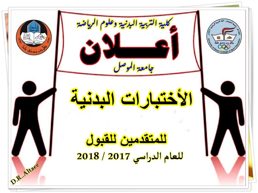 تعلن كليةالتربية البدنية وعلوم الرياضة اللجنة المشرفة عن التقديم والقبول عن اجراءالاختبارات البدنية للطلبة المتقدمين للقبول المباشر للعام الدراسي 2017 / 2018 وذلك يوم الاربعاء 20 / 9 /2017 الساعة الثامنة والنصف صباحاً على ملاعب وقاعات الكلية في الموقع الرئيسي لجامعة الموصل وتكون الاختبارات البدنية للمتقدمين من الوجبة الاولى للطلبةهذا بالاضافة الى الايام التالية من الاختبارات يومي الخميس والسبت من تاريخ بدء الاختبارات في 20 / 9 /2017