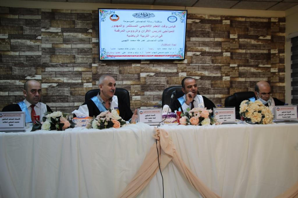 رسالة ماجستير في كلية التربية البدنية وعلوم الرياضة ” قياس وقت التعلم الاكاديمي المستثمر والمهدور لنموذجي تدريس الاقران والرؤوس المرقمة في درس التربية الرياضية “ناقشت كلية التربية البدنية وعلوم الرياضة بجامعة الموصل رسالة ماجستير في طرائق تدريس التربية الرياضية ، يوم الخميس الموافق 14/ 10/ 2021، حضر جانبا منها الاستاذ الدكتور محمد خليل محمد معاون العميد للشؤون الادارية وعدد من تدريسيي الكلية .تناولت الرسالة التي تقدم بها الباحث عمر طه محمد، تحليل السلوك التعليمي للطالب باستخدام نماذج تدريس الأقران والرؤوس المرقمة والأسلوب الأمري في تعليم مهارات الدرس. اختيار النموذج التدريسي الأفضل في وقت التعلم الأكاديمي عند تعليم المهارات الحركية.تهدف الدراسة الى قياس درجة السلوك التعليمي في مجاميع البحث الثلاثة من خلال بنود استمارة اندرسون, قياس وقت التعلم الأكاديمي والمهدور لنموذجي تدريس الأقران والرؤوس المرقمة في تعلم المهارات الحركية في درس التربية الرياضية, ايجاد دلالة الفروق في مجموع وقت التعلم الأكاديمي والمهدور لنماذج تدريس الأقران والرؤوس المرقمة والأسلوب الأمري في تعلم المهارات الحركية في درس التربية الرياضية .ترأس لجنة المناقشة الاستاذ الدكتور ليث محمد داؤد وعضوية كل من الاستاذ المساعد الدكتور سلوان خالد محمود و الاستاذ المساعد الدكتور منيب صبحي شهاب ، وبإشراف وعضوية الاستاذ الدكتور وليد وعدالله علي