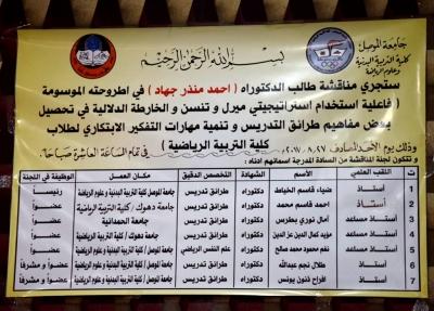 مناقشة طالب الدكتوراه احمد منذر جهاد في كلية التربية البدنية وعلوم الرياضة جامعة الموصل