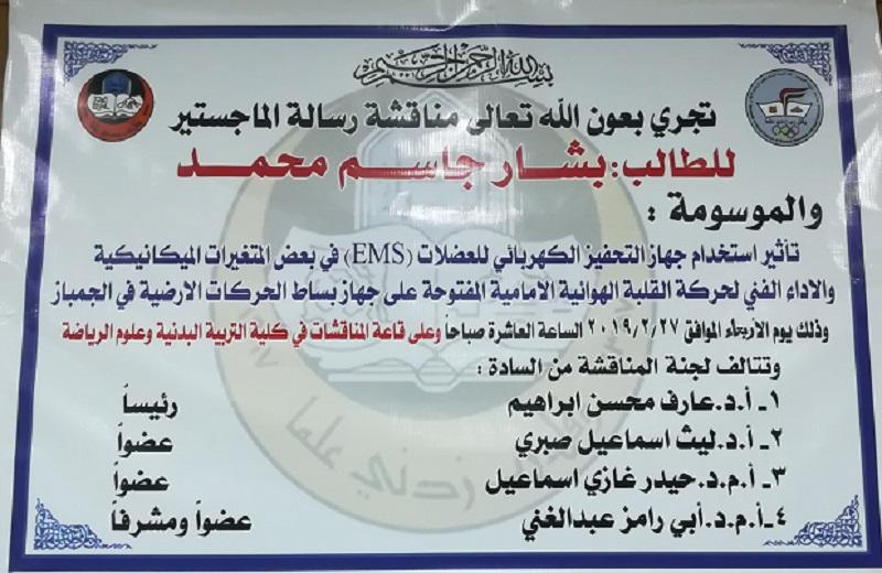 في رحاب كلية التربية البدنية وعلوم الرياضة جامعة الموصل تمت مناقشة طالب الماجستير بشار جاسم محمد في رسالته الموسومة "تاثير استخدام جهاز التحفيز الكهربائي للعضلات (EMS)في بعض المتغيرات الميكانيكية والأداء الفني لحركة القلبة الهوائية المفتوحة على جهاز بساط الحركات الأرضية في الجمباز "باشراف الاستاذ المساعد الدكتور ابي رامز عبدالغني وتالفت لجنة المناقشة من: