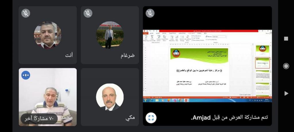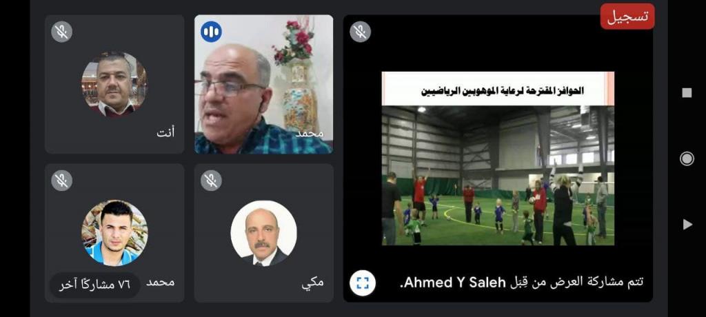 برعاية الأستاذ الدكتور قصي كمال الدين الاحمدي المحترم وباشراف مباشر من قبل الاستاذ الدكتور احمد حامد السويدي عميد كلية التربية البدنية وعلوم الرياضة اقامت شعبة التعليم المستمر بالتعاون مع فرع الألعاب الفرقية ندوتها العلمية الإلكترونية (مراكز الموهبة الرياضية ودورها في الارتقاء الرياضي) عبر فضاء الانترنت وعلى منصة ال (meet) كانت المحاضرة الأولى بعنوان (برنامج مقترح لرعاية الموهوبين الرياضيين بين الواقع والمأمول بمنظور علمي) القاها أ.د ضرغام جاسم النعيمي و أ.م.د خالد عبد المجيد الخطيب