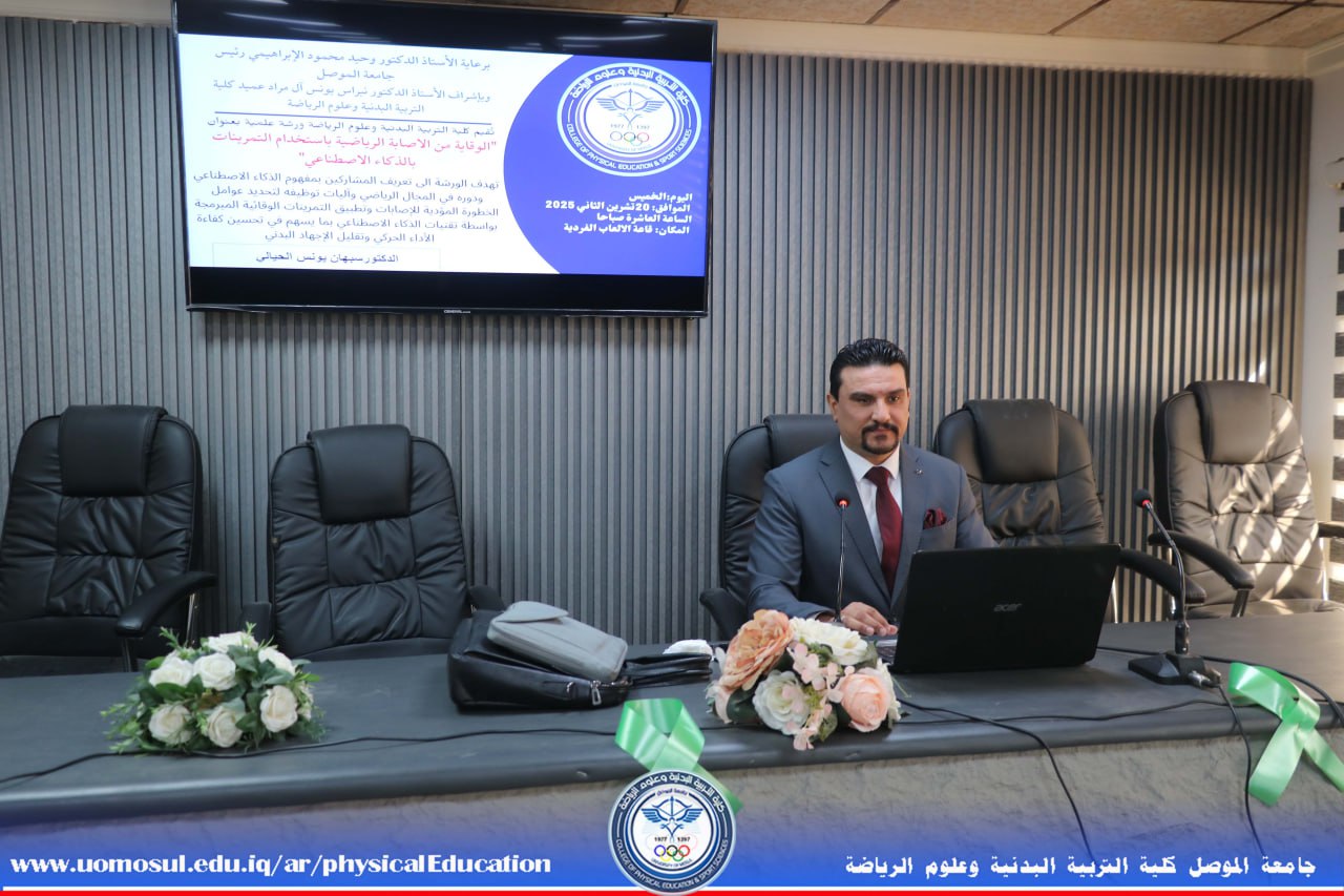 وذلك بمشاركة عدد من أساتذة وطلبة الكلية قدّم الورشة الدكتور سبهان يونس الحيالي حيث تناول خلالها أهمية توظيف تقنيات الذكاء الاصطناعي في تصميم التمرينات الوقائية وتحليل الأداء الرياضي لتقليل مخاطر الإصابات.