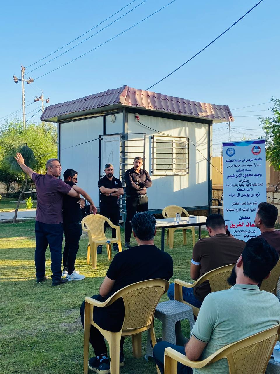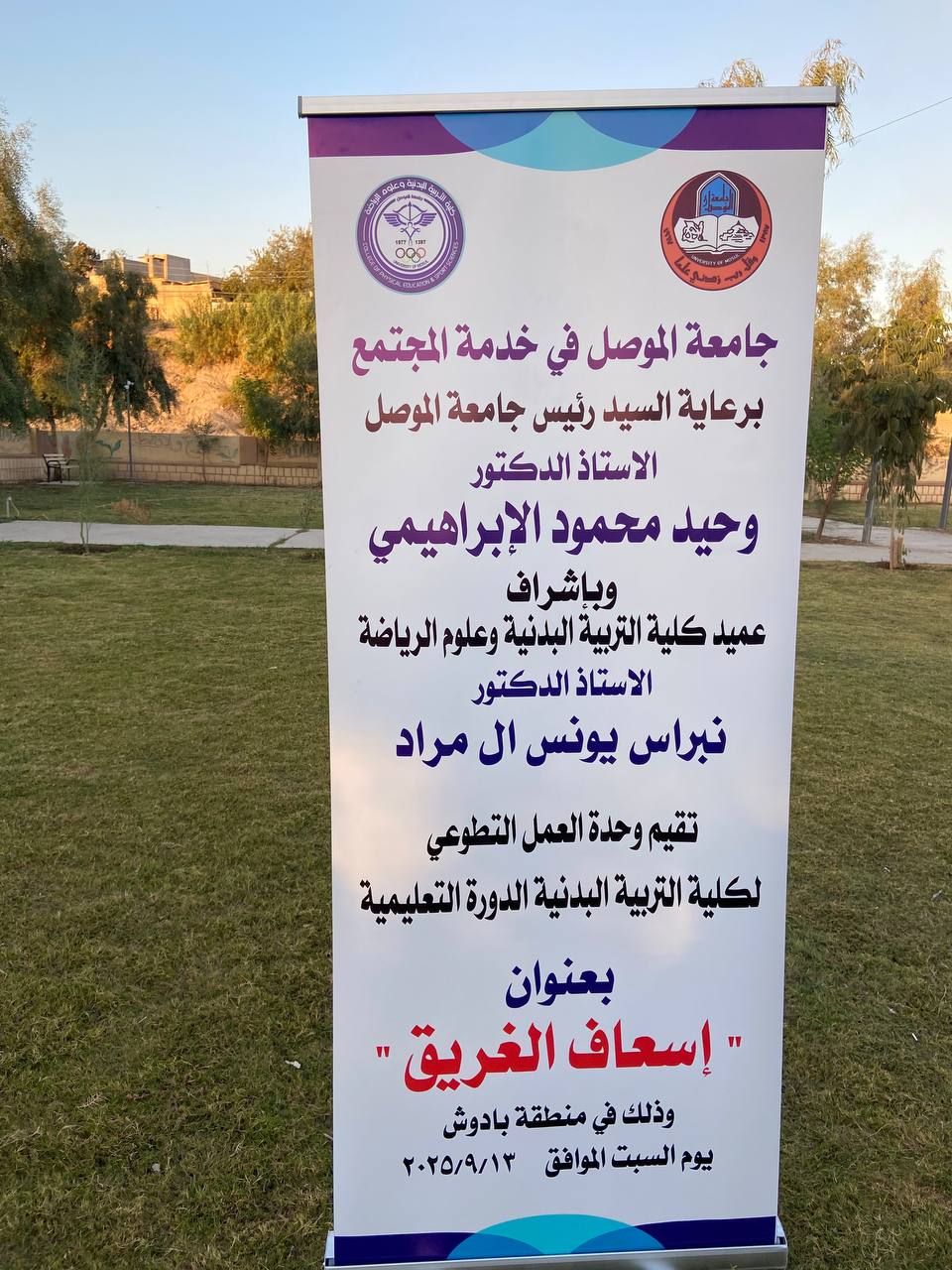 برعاية السيد رئيس جامعة الموصل الأستاذ الدكتور وحيد محمود الابراهيمي وبإشراف السيد عميد كلية التربية البدنية وعلوم الرياضة الأستاذ الدكتور نبراس يونس محمد آل مراد، وانطلاقًا من رسالة الجامعة في خدمة المجتمع وتعزيز ثقافة الوقاية والسلامة العامة، نظّمت وحدة العمل التطوعي في الكلية، بالتعاون مع شعبة الإرشاد النفسي الجامعي ووحدة التعليم المستمر، وبمشاركة نخبة من أساتذة وطلبة الكلية، دورة تدريبية بعنوان: إسعاف الغريق   والتي أُقيمت في منطقة بادوش يوم السبت الموافق 13 أيلول 2025.