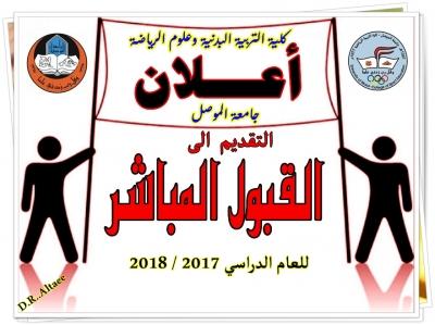 تعلن كلية التربية البدنية وعلوم الرياضة جامعة الموصل عن فتح باب التقديم للقبول المباشر في الكلية للعام الدراسي 2017 /2018 لخريجي الدراسة الاعدادية ( العلمي / الادبي/ المهني ) ولغاية نهاية الدوام الرسمي ليوم الاحد 2017/9/10 على وفق الضوابط المعتمدة من قبل وزارة التعليم العاليوسيكون التقديم في موقع الكلية في الموقع الرئيسي لجامعة الموصل في مدينة الموصل , ويكون استلام استمارات التقديم من لجنة القبول والتقديم في الكلية