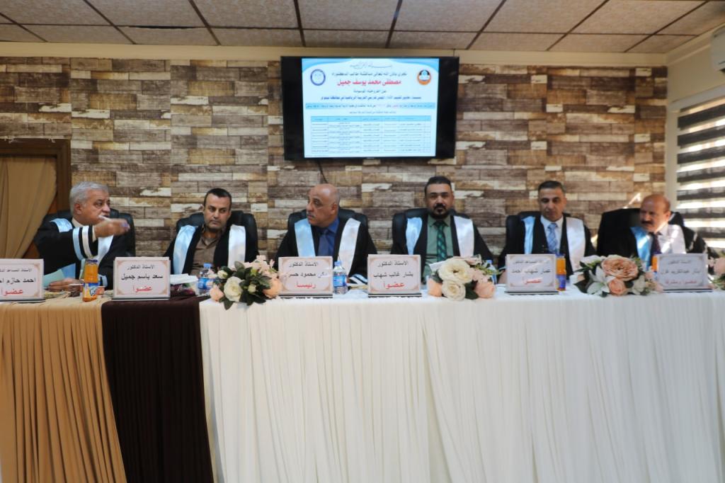ترأس لجنة المناقشة الاستاذ الدكتورمكي محمود حسينوعضوية كل من الاستاذ الدكتوربشار غالب شهابو الاستاذ الدكتور سعد باسم جميل والأستاذ المساعد الدكتور احمد حازم احمد والأستاذ المساعد الدكتور عمار شهاب احمد ، وباشراف وعضوية الأستاذ الدكتور ايثار عبد الكريم غزال