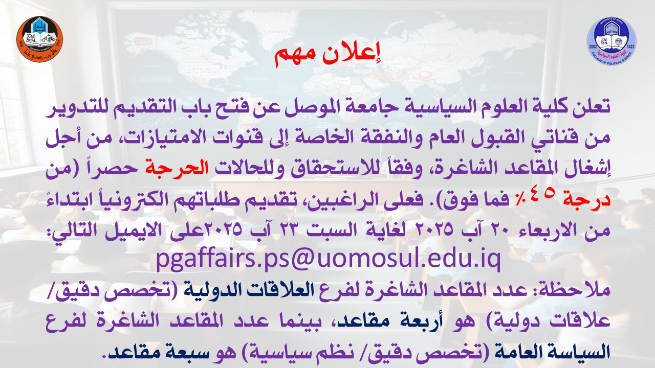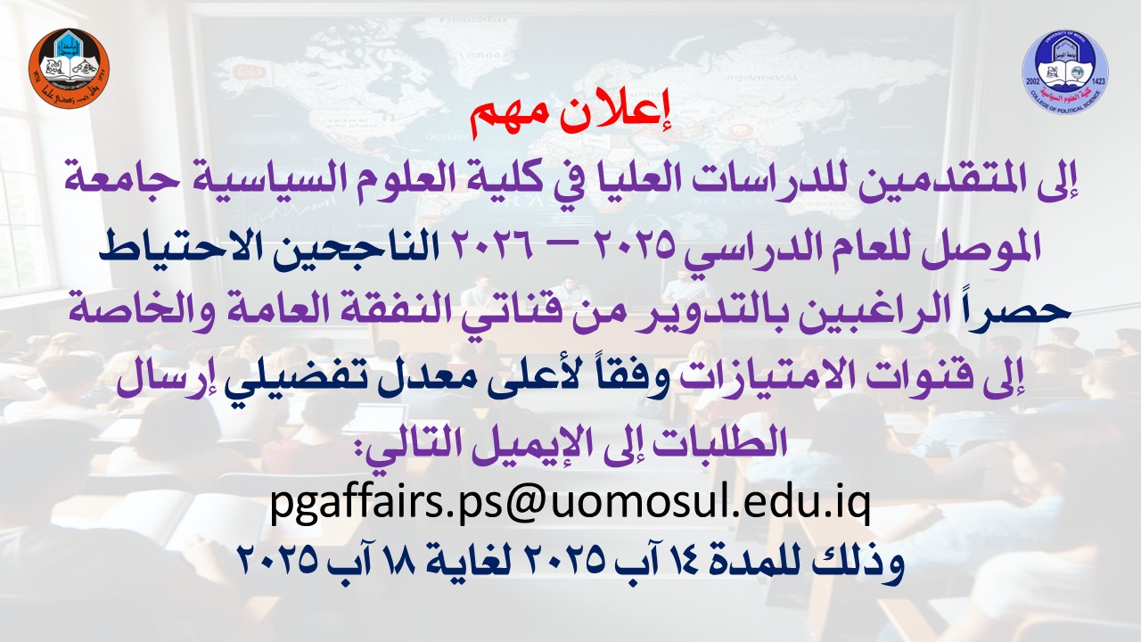 ⚠️ تنويه مهم 🎓 بخصوص التقديم للدراسة المسائية لكلية العلوم السياسية جامعة الموصل للعام الدراسي 2025 – 2026 ______________ 📝 المشمولون بالتقديم: خريجو الدراسة الإعدادية [إقرأ المزيد]