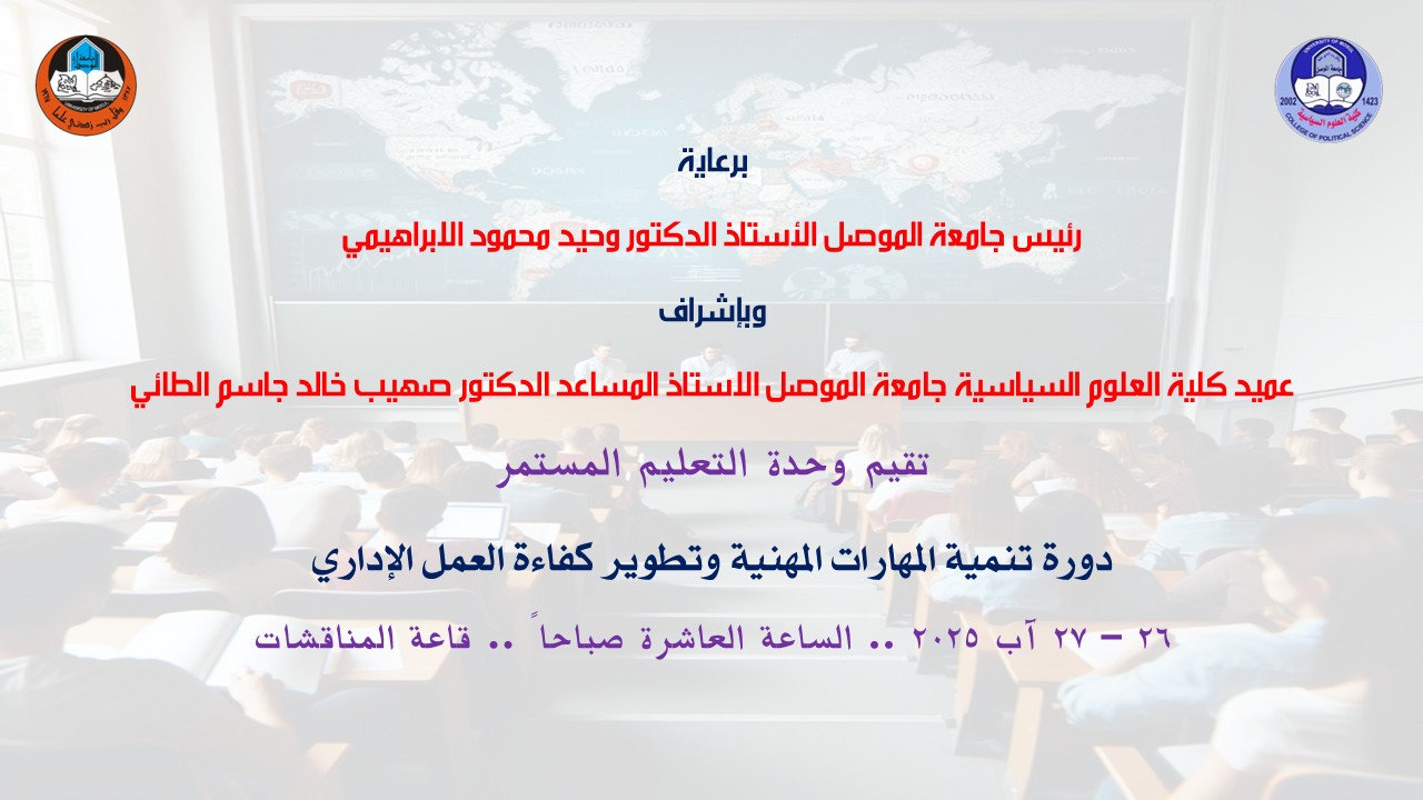 🏛️برعاية رئيس جامعة الموصل: الأستاذ الدكتور وحيد محمود الإبراهيمي 🎓بإشراف عميد كلية العلوم السياسية: الأستاذ المساعد الدكتور صهيب خالد جاسم الطائي 📘تقيم الكلية الورشة العلمية: [إقرأ المزيد]