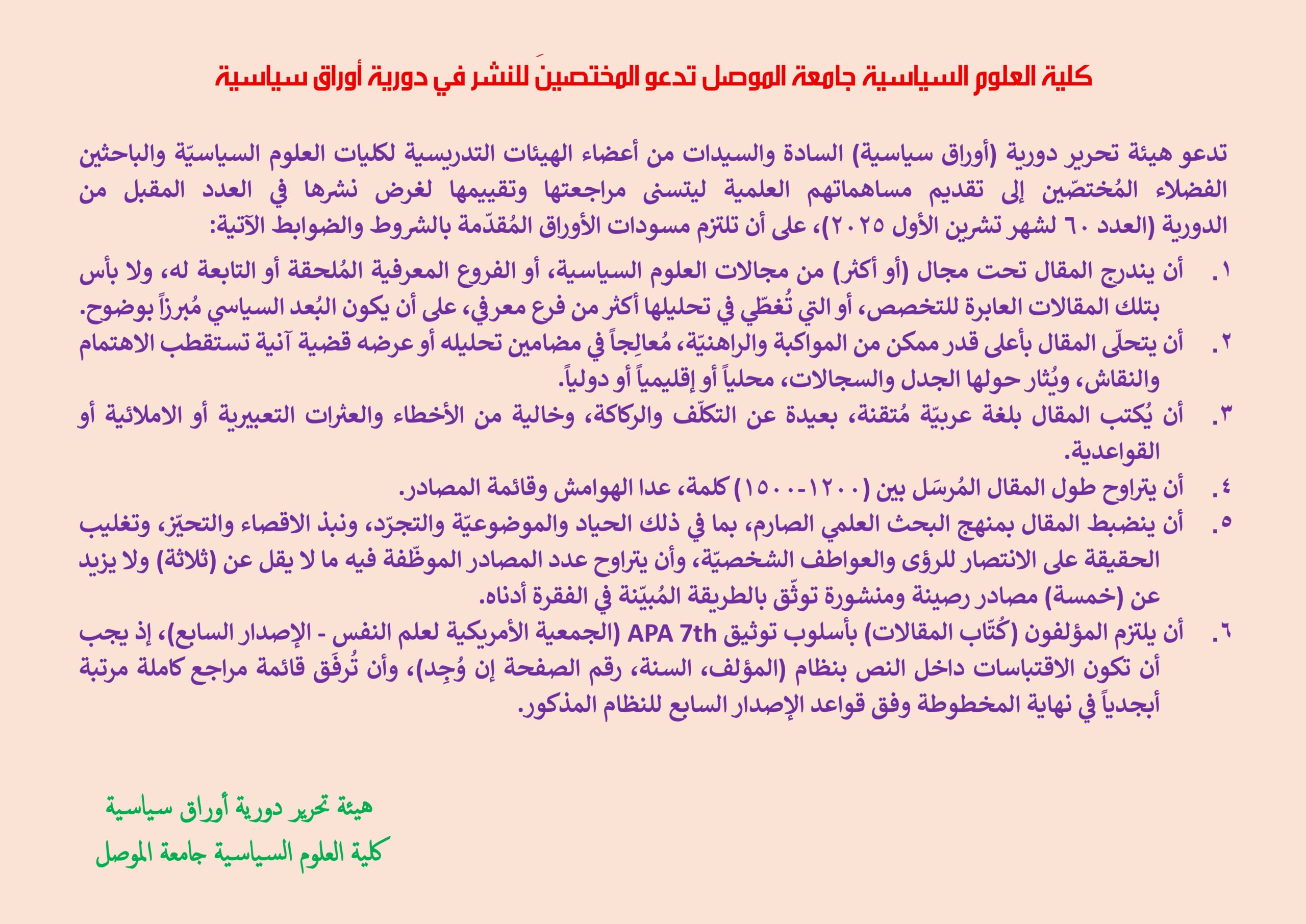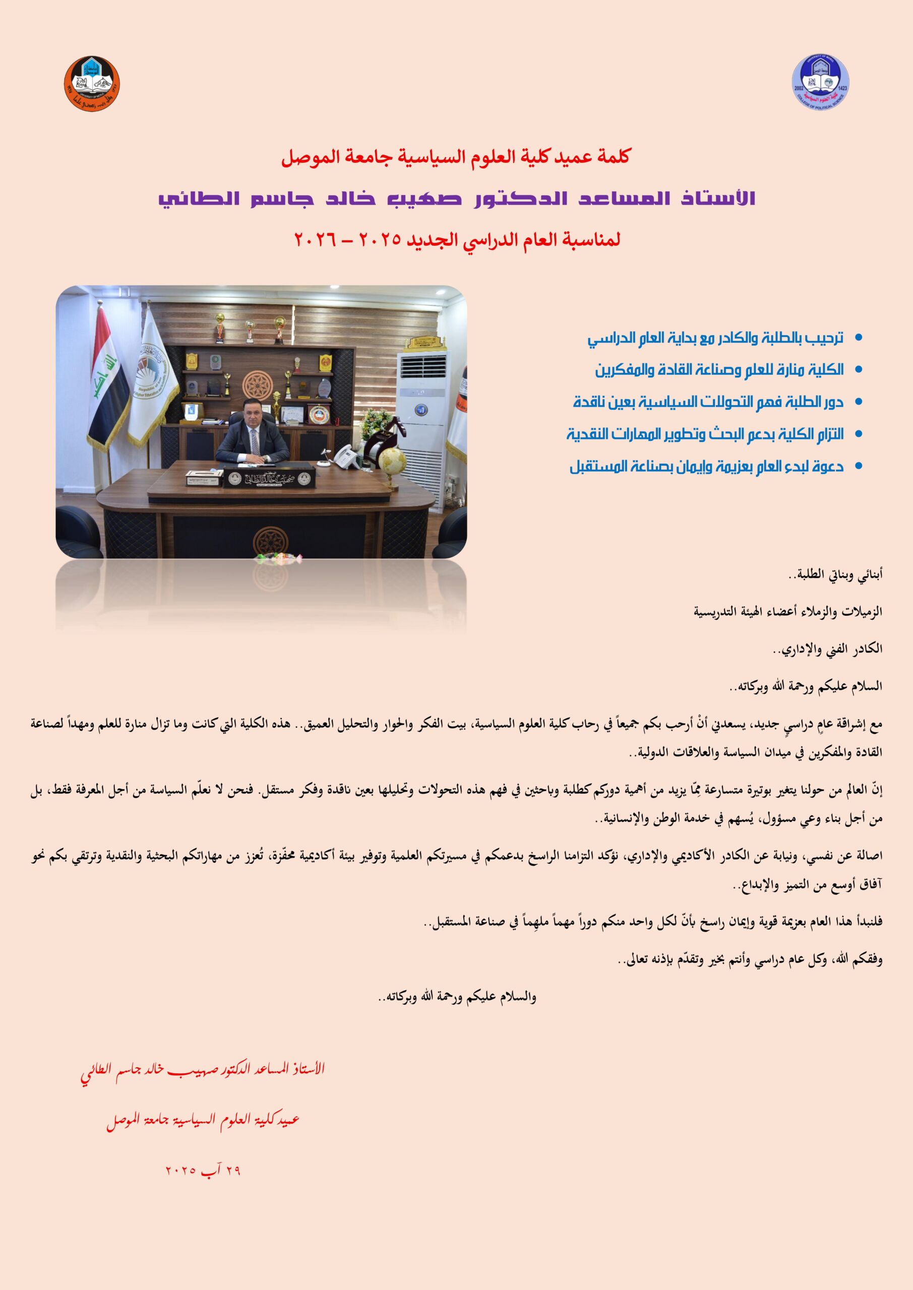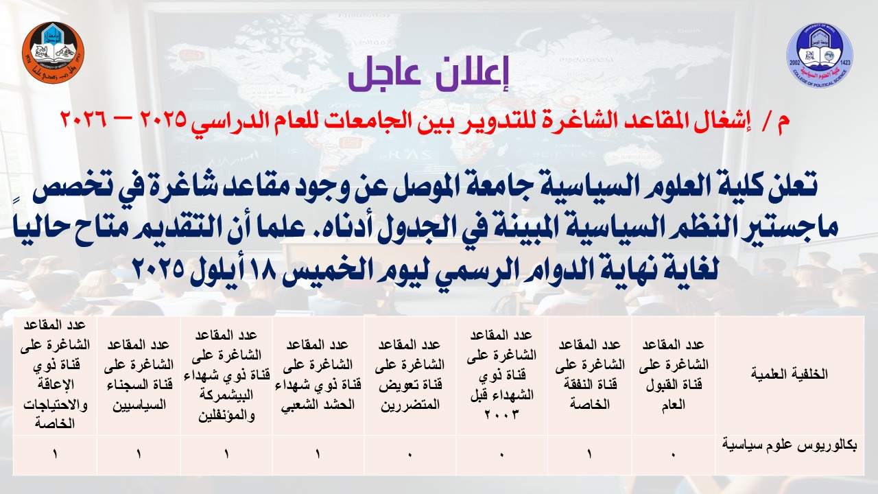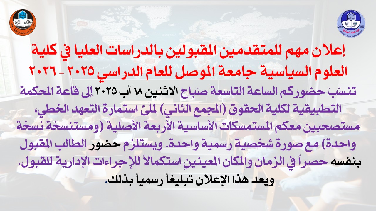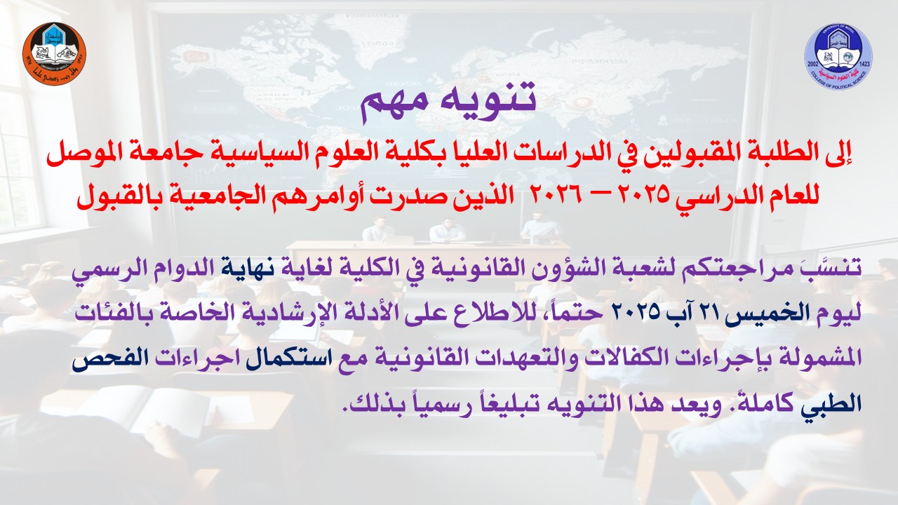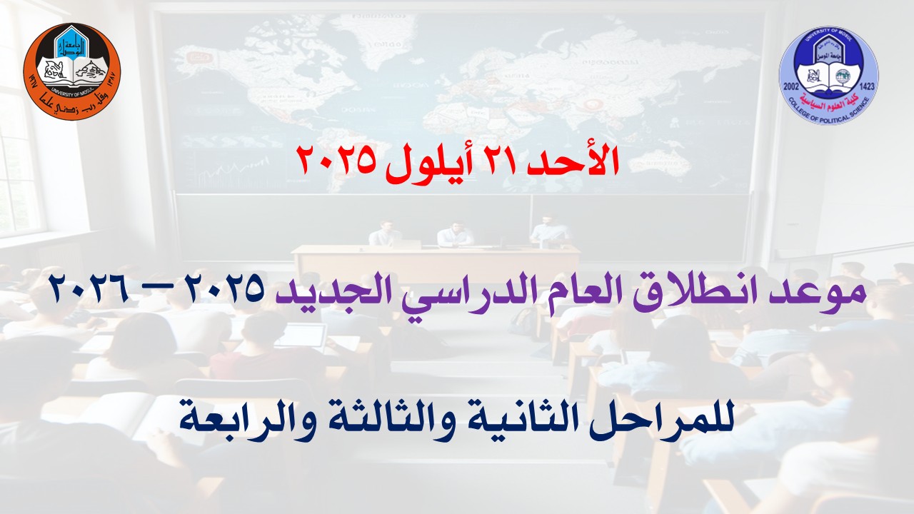 🎓 على بركة الله تبدأ كلية العلوم السياسية جامعة الموصل/الدراسات الصباحية باستقبال الطلبة الجدد للعام الدراسي 2026 - 2025 📅 بدأ التقديم فعلياً منذ الاثنين [إقرأ المزيد]