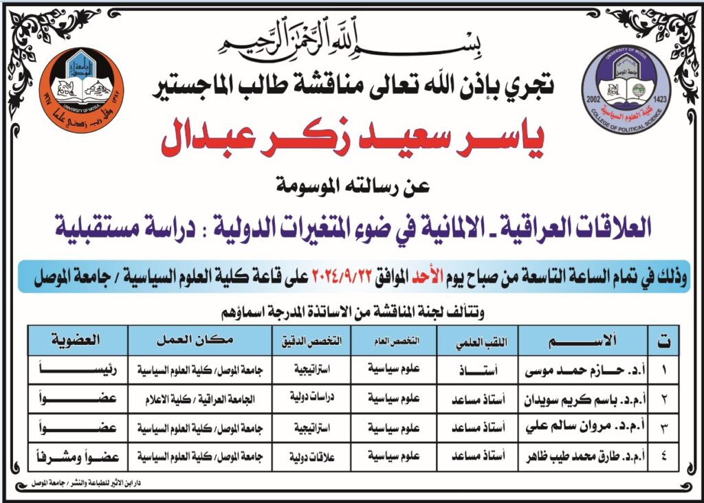 إعلان مناقشة رسالة ماجستير ليوم الاثنين 23 أيلول 2024