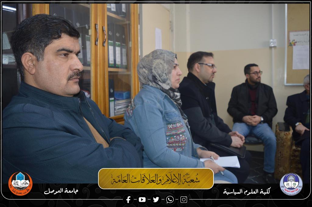 اجتماع أعضاء الهيئة التدريسية في فرع السياسة العامة………………………………….عقد فرع السياسة العامة في كليتنا اجتماعاً مع أعضاء الهيئة التدريسية في الفرع برئاسة الأستاذ الدكتور وليد سالم محمد يوم الأحد الموافق 15 كانون الثاني 2023.تضمن الاجتماع مناقشة العديد من الموضوعات المتعلقة بامتحانات نصف السنة لطلبة الدراسات الأولية، فضلاً عن الموضوعات الأخرى المدرجة في جدول اعمال الفرع العلمي.