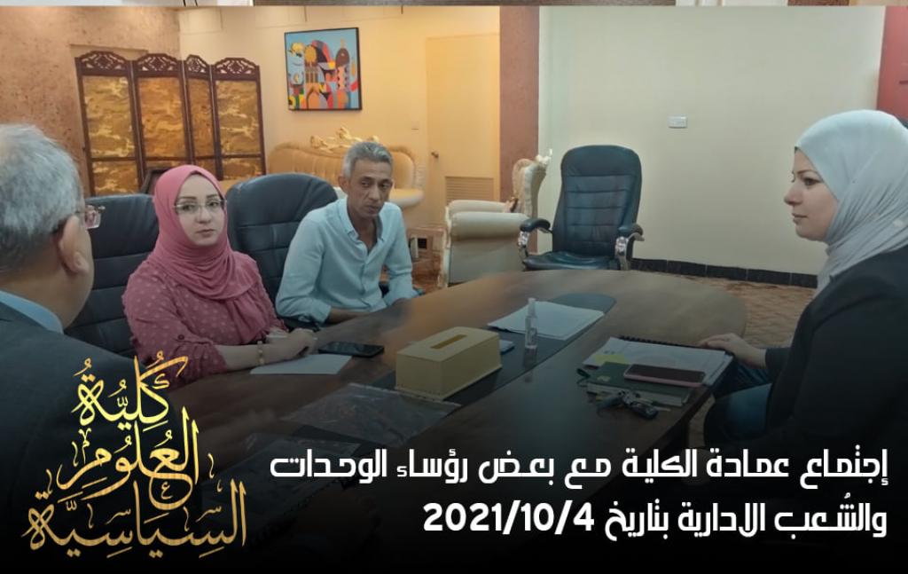 بحضور الأستاذ المساعد الدكتور طارق محمدطيب القصَّار عميد كلية العلوم السياسية، والدكتورة إكرام فالح أحمد معاون العميد للشؤون الإدارية والمالية، وعدد من رؤساء الشعب والوحدات الإدارية في كليتنا، تم عقد اجتماع خاص يوم الإثنين الموافق 2021/10/4 للتباحث بشأن استعدادات الكلية للعام الدراسي 2021- 2022، وتهيئة الكتب المنهجية لطلبة الدراسات الأولية، فضلاً عن إجراءات استقبال الطلبة مطلع الأسبوع القادم.