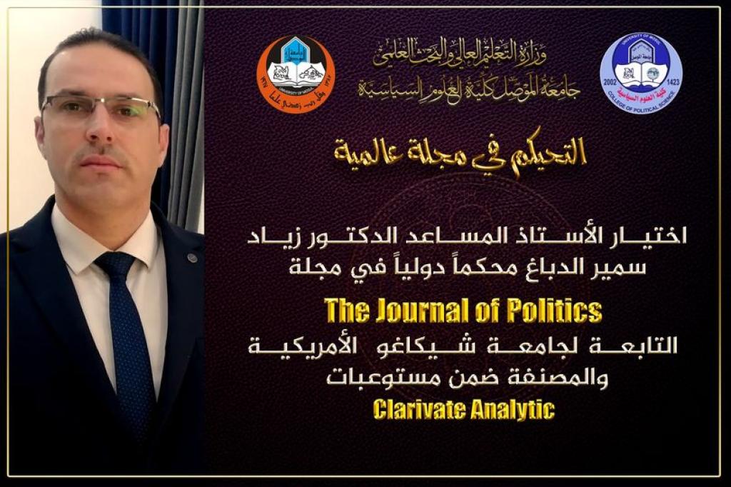 “اختيار محكم دولي في مجلة عالمية”……………………………اختيار الأستاذ المساعد الدكتور زياد سمير الدباغ محكماً دولياً في مجلة The Journal of Politics التابعة لجامعة شيكاغو الأمريكية والمصنفة ضمن مستوعبات Clarivate Analytic، علماً أن المجلة من الفئة الاولى Q1 وتنشر ابحاثها منذ عام 1939.